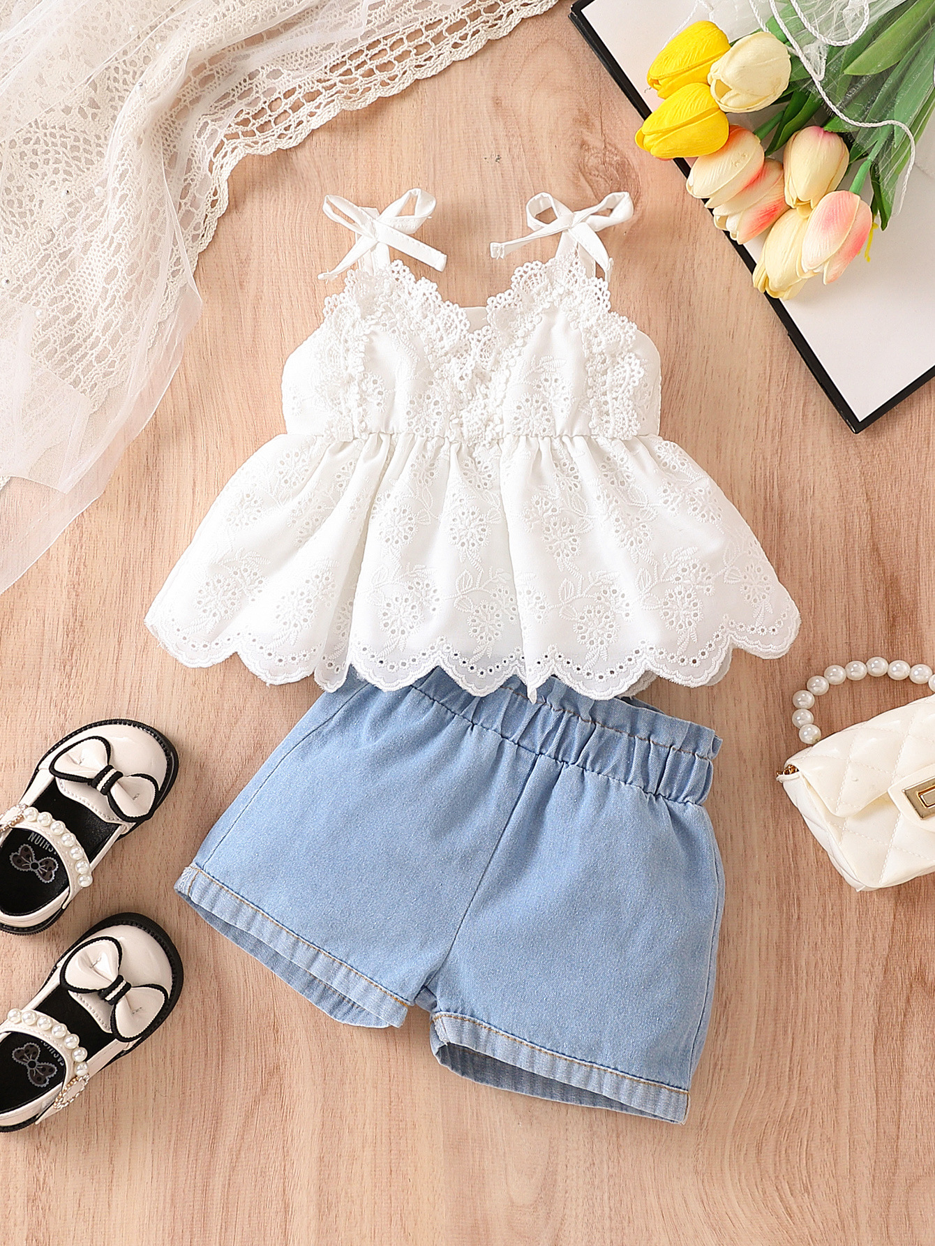 Set de 2 piese cu top evazat din dantelă de bumbac cu decolteu în V și pantaloni scurți din denim Lace Grace