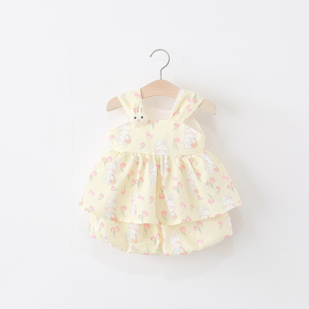 – Top cu croială tip A, confecționat din material durabil, într-o nuanță galbenă delicată, cu imprimeu integral cu iepurași drăgălași, fundițe roz și piersicuțe. Model cu bretele late și căptușeală pentru confort, decorat cu un iepuraș 3D cu coroniță – un accent jucăuș ce atrage imediat atenția. Croiala asigură o cădere lejeră și un aspect răcoros, perfect pentru zilele călduroase. Încrețiturile fine sub bust oferă volum și o formă fermecătoare.