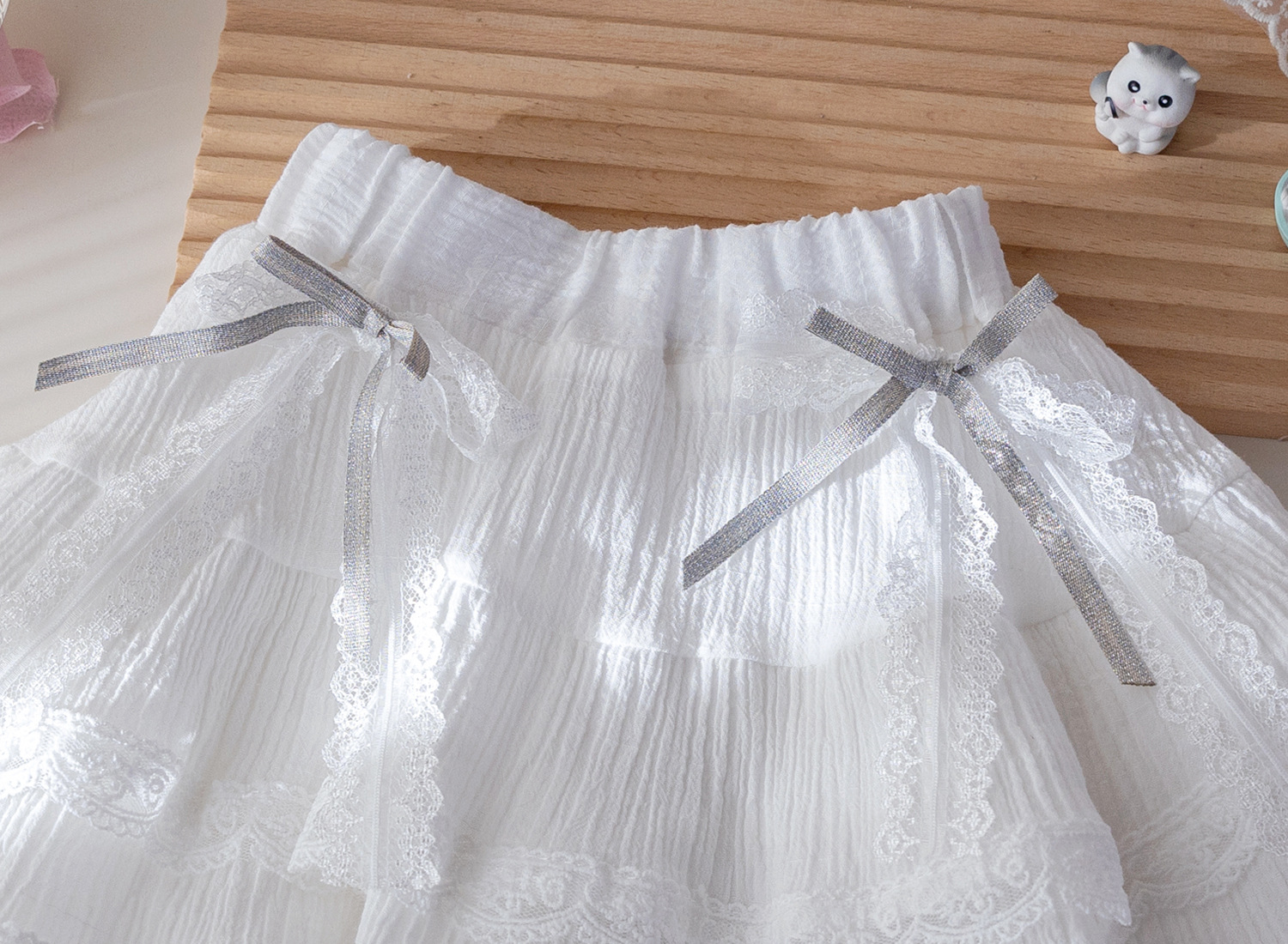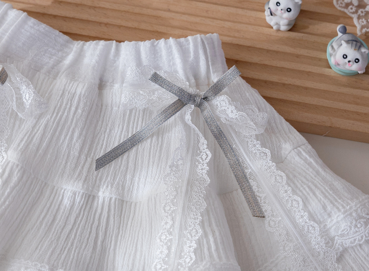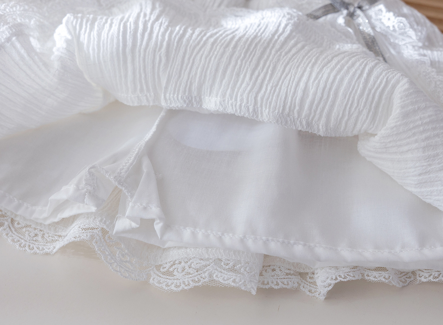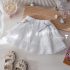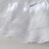 – Fustă albă, confecționată dintr-un material ușor și diafan, cu design stratificat. Modelul are o căptușeală tip pantalonaș, margini din dantelă și pliuri care oferă volum și lejeritate. În talie este adăugată o bandă decorativă subțire cu fundiță, care completează ținuta cu un accent fin și elegant.