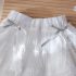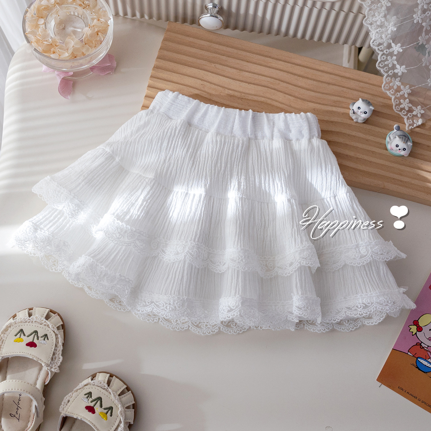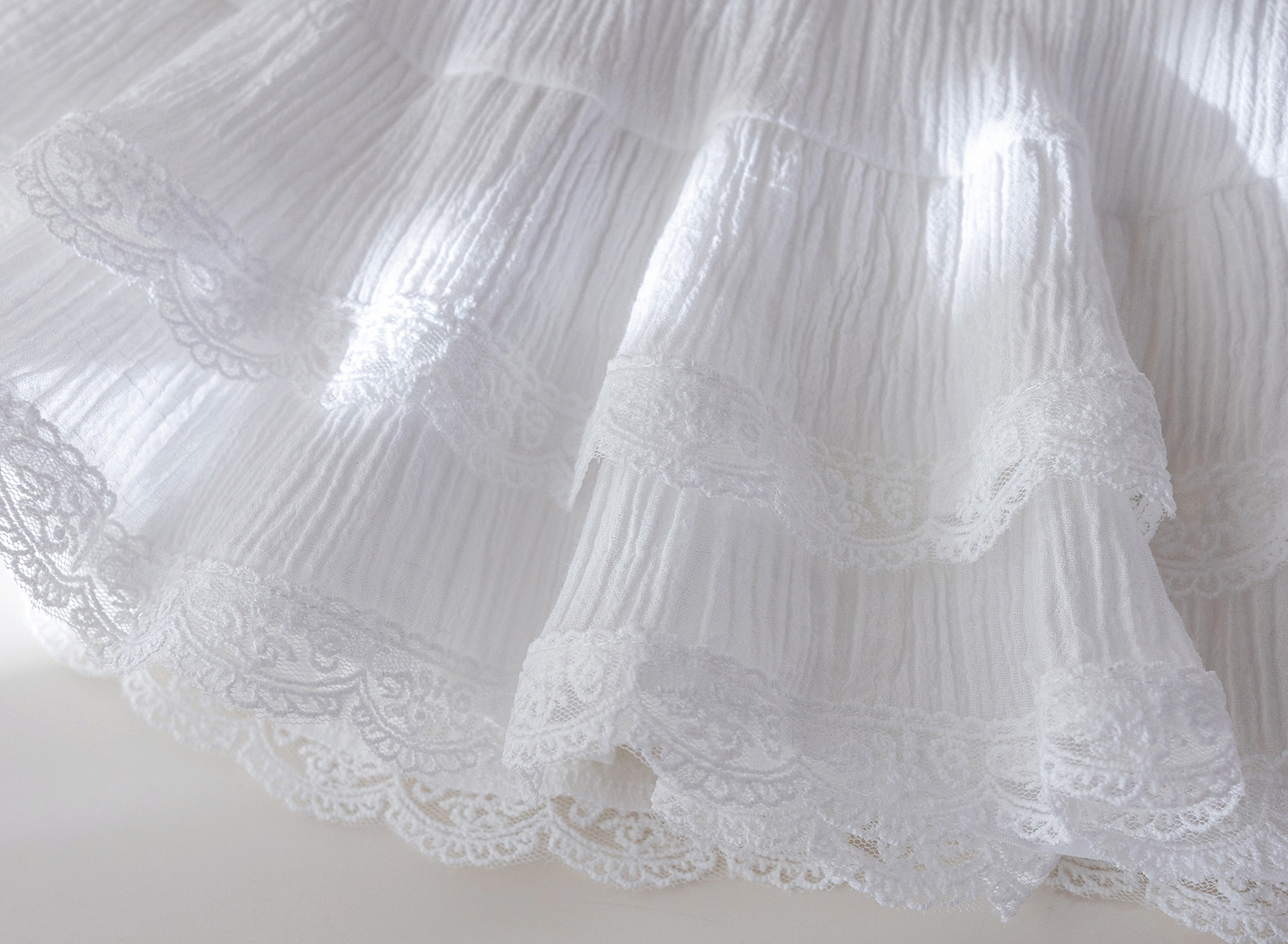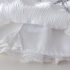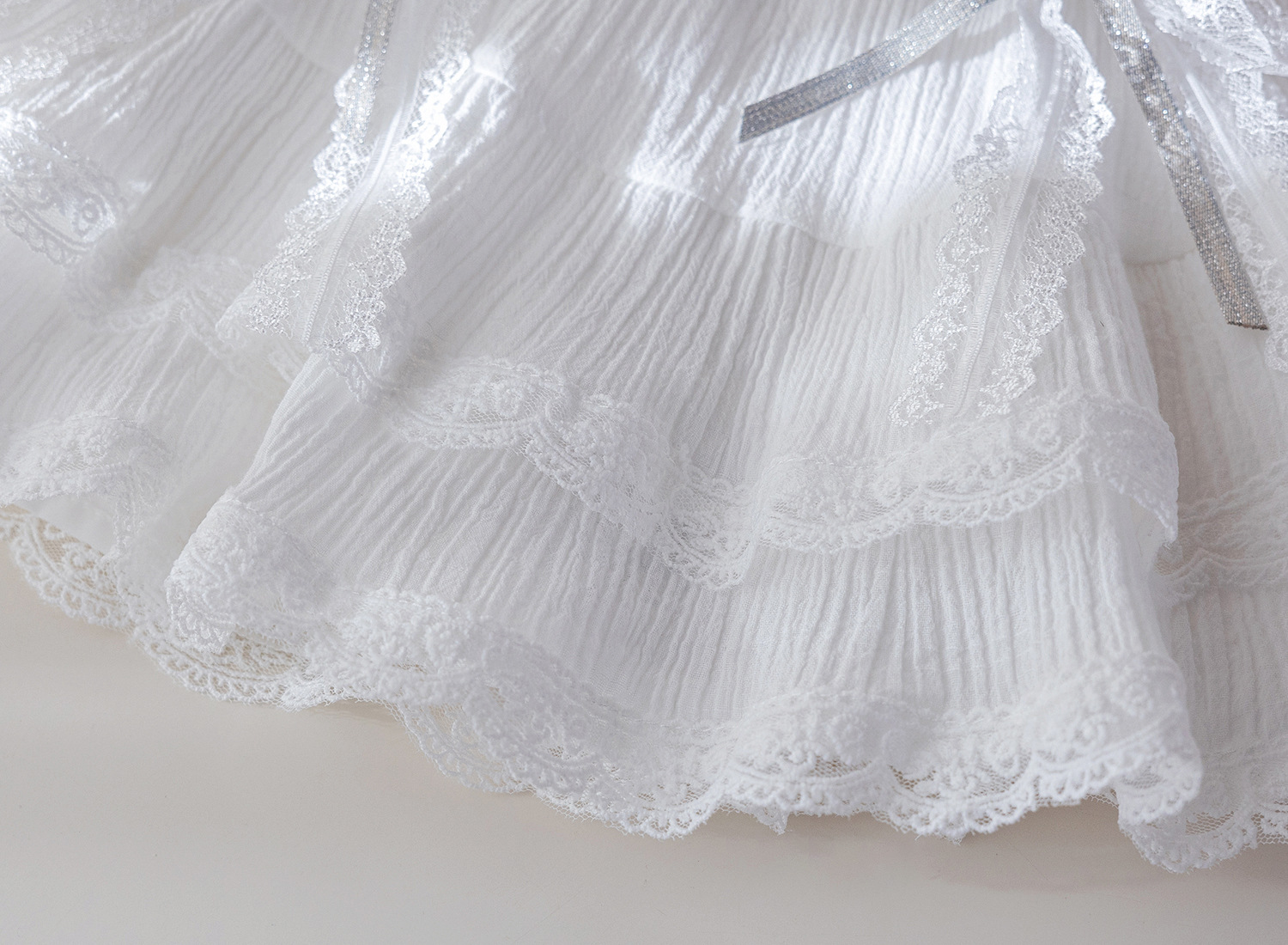 – Fustă albă, confecționată dintr-un material ușor și diafan, cu design stratificat. Modelul are o căptușeală tip pantalonaș, margini din dantelă și pliuri care oferă volum și lejeritate. În talie este adăugată o bandă decorativă subțire cu fundiță, care completează ținuta cu un accent fin și elegant.