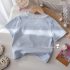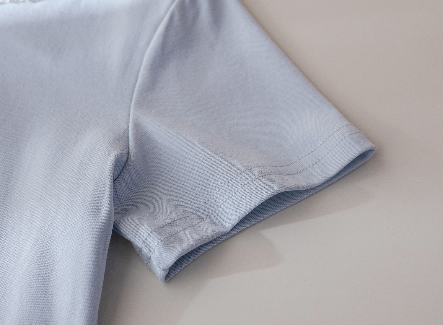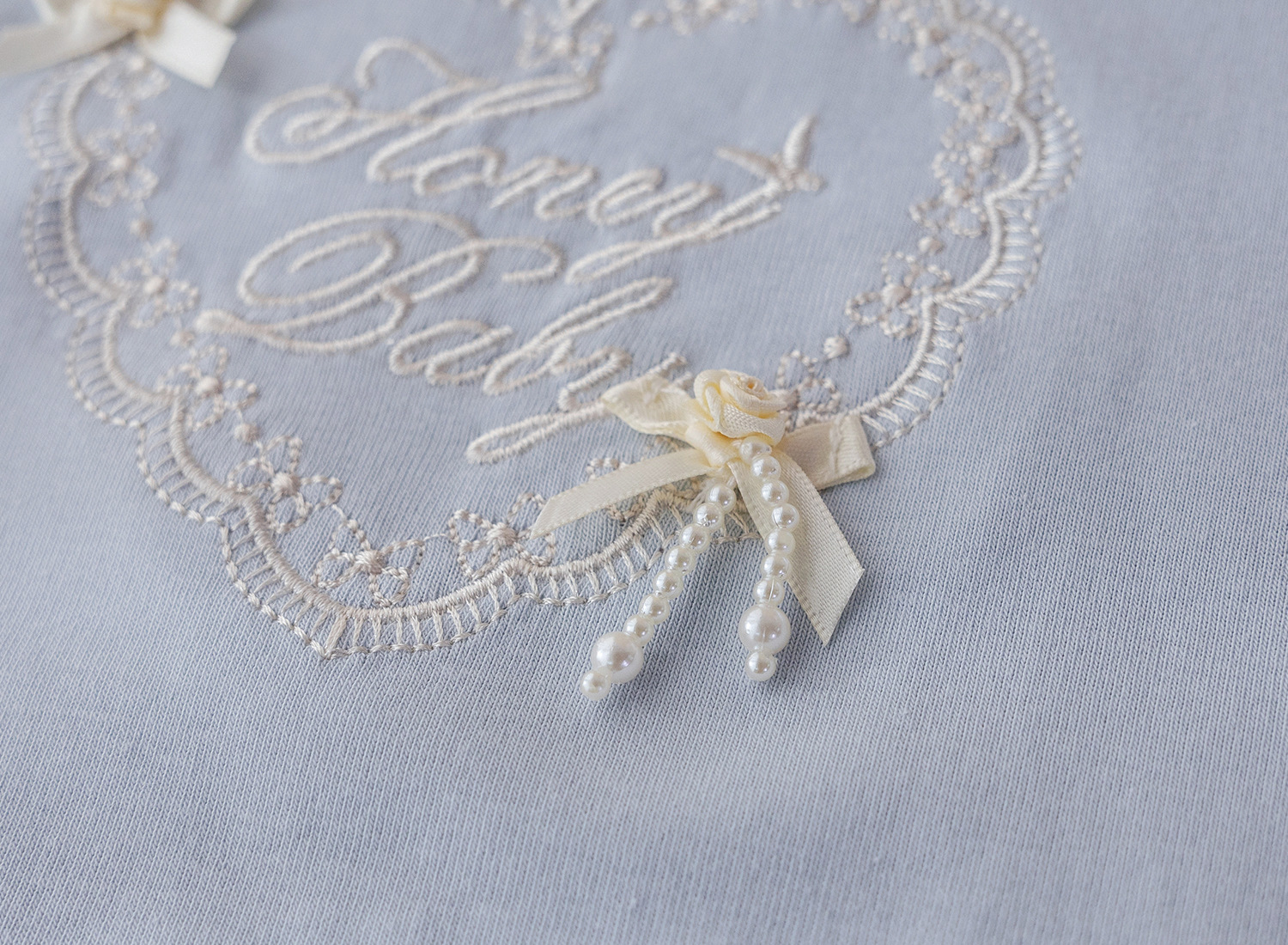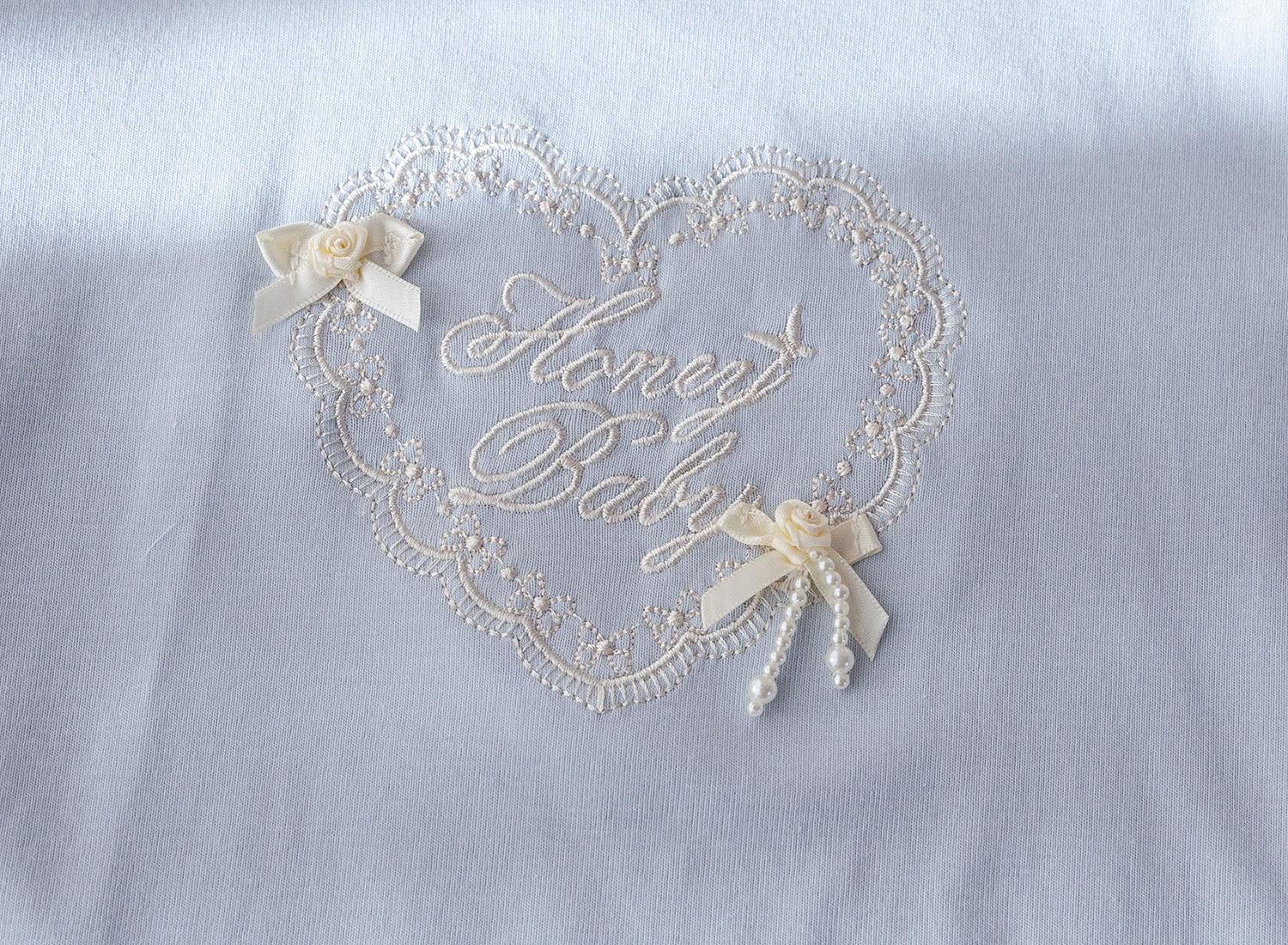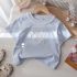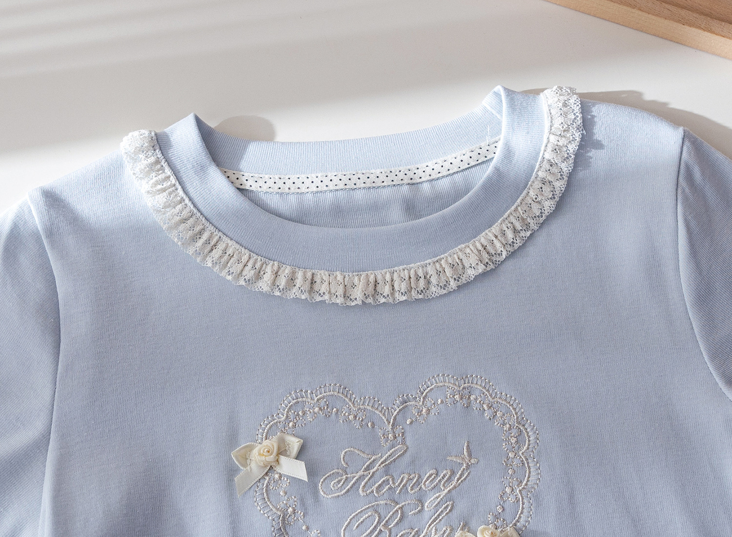 – Tricou cu mânecă scurtă, într-o nuanță delicată de albastru deschis, confecționat din bumbac moale și plăcut la atingere. Modelul are un decolteu rotund, finisat cu dantelă fină, care oferă un aspect rafinat și complet. În partea din față este adăugată o broderie frumoasă cu inscripție și elemente decorative în formă de inimă, completată cu fundițe mici – un accent delicat ce conferă o notă romantică.