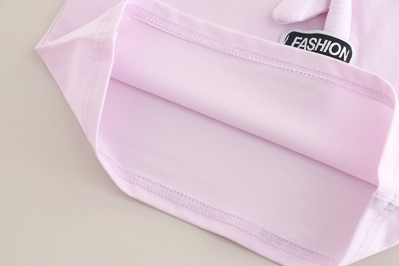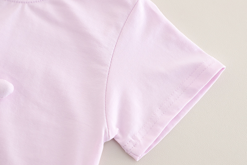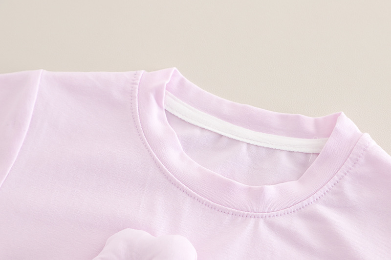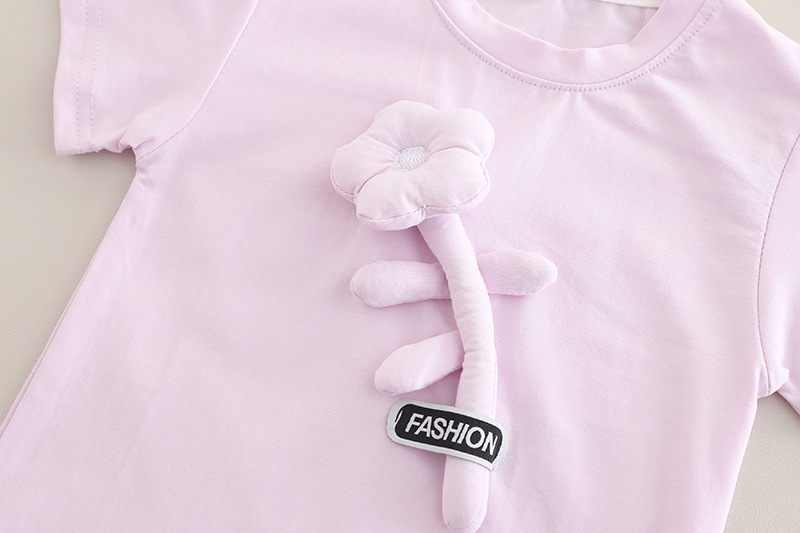 – Tricou cu mânecă scurtă, într-o nuanță de roz deschis, confecționat din bumbac moale și respirabil. În față este aplicată o floare textilă 3D, cu petale în relief și o mică emblemă „Fashion” – un detaliu stilat ce oferă un aer contemporan.