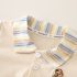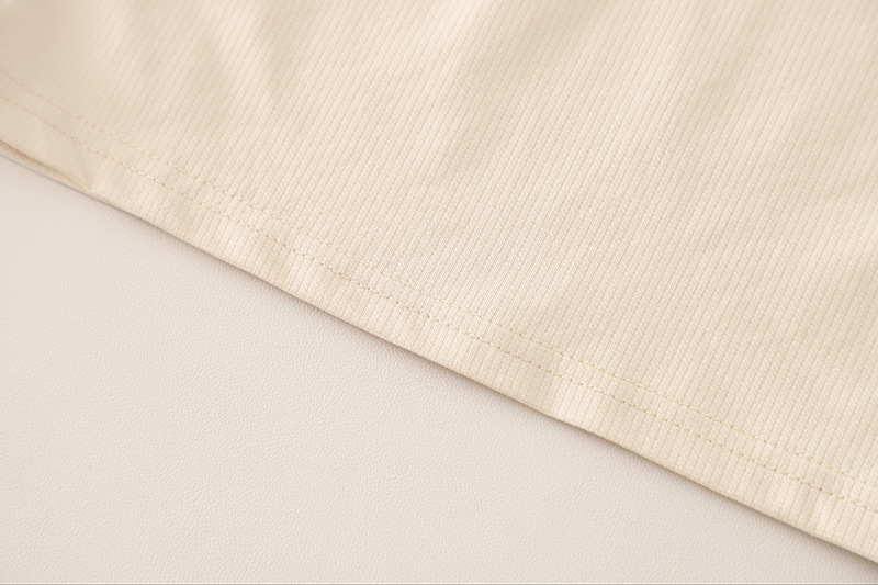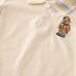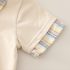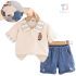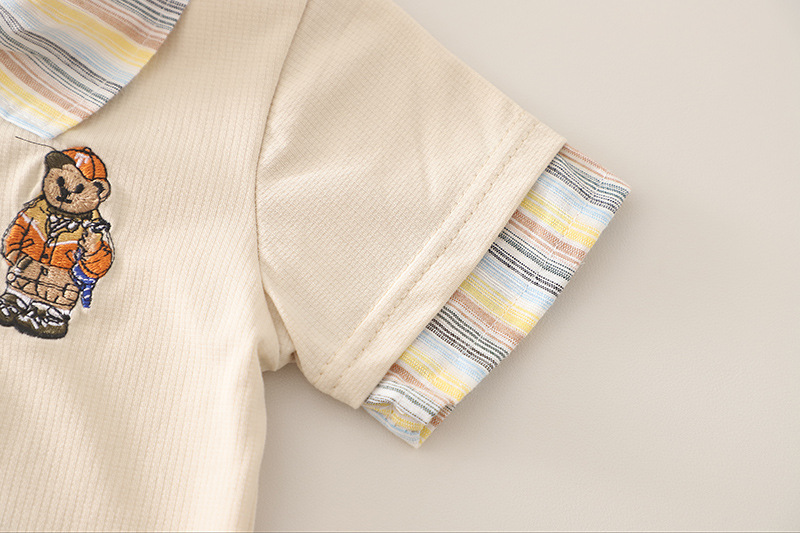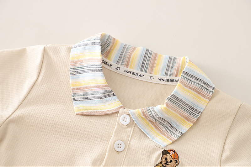 – Tricou cu mânecă scurtă, confecționat dintr-un material de bumbac moale și plăcut la atingere, în culoare bej. Modelul are guler clasic, decorat cu dungi fine în culori pastelate, care oferă un accent proaspăt și distinctiv. Se închide cu nasturi în față, iar mânecile au tivuri în același material în dungi, pentru un aspect finisat și stilat. În partea din față este adăugată o broderie drăgălașă cu un ursuleț îmbrăcat într-o mică ținută, care adaugă o notă jucăușă și copilărească. Croiala este comodă și permite libertate de mișcare.
