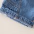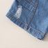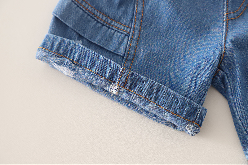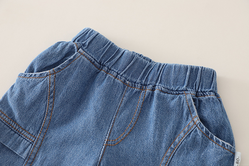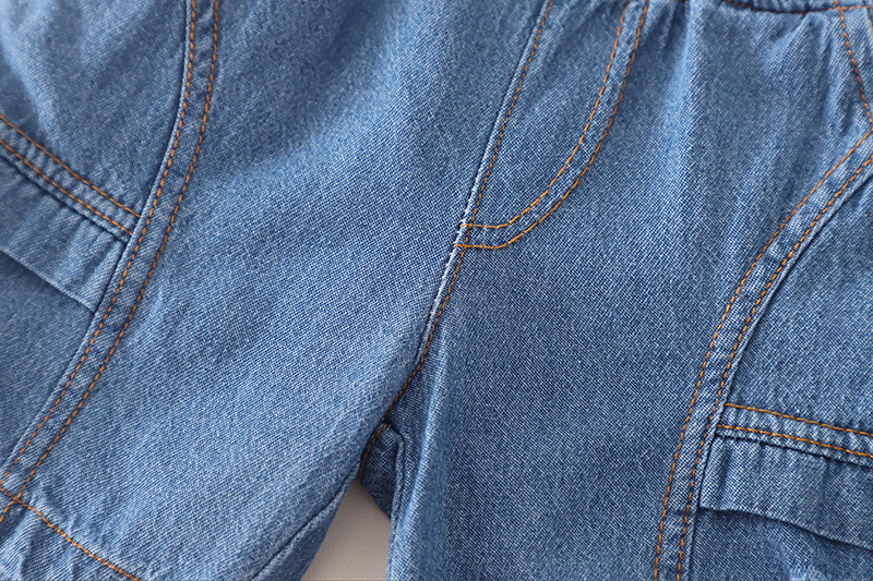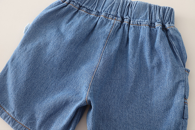 – Pantaloni scurți din denim, într-o nuanță clasică de albastru, realizați dintr-un material de jean moale și rezistent. Modelul are talie elastică pentru confort și îmbrăcare ușoară, precum și buzunare practice. Mânecii sunt ușor îndoiți, iar uzurile delicate adaugă un accent modern și relaxat. Croiala este lejeră și confortabilă pentru joacă activă și plimbări.