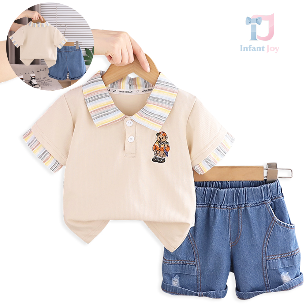 • Set de 2 piese cu tricou cu guler clasic și pantaloni din denim Little Cadet Beige