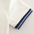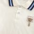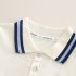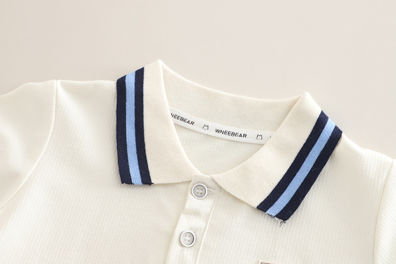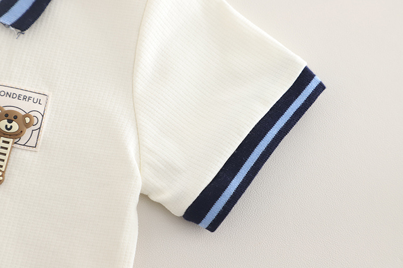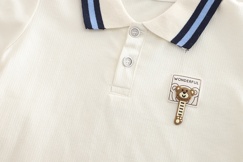 -Tricou cu mânecă scurtă, din bumbac de calitate superioară, cu textură ușor gofrată, în nuanță delicată de ecru – decorat cu borduri contrastante bleumarin la guler și mâneci – model cu guler clasic și nasturi pentru îmbrăcare ușoară – în partea stângă se află o mică aplicație cu ursuleț și inscripție – cheia unei dispoziții vesele