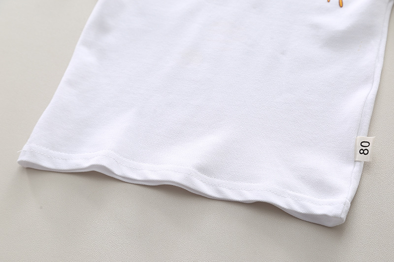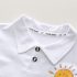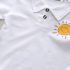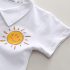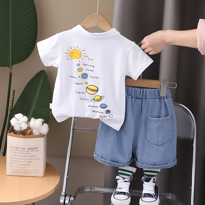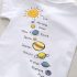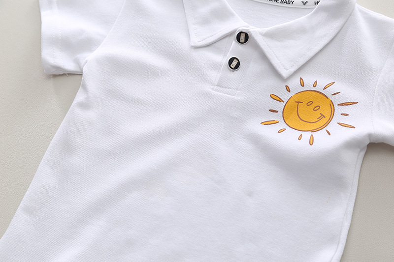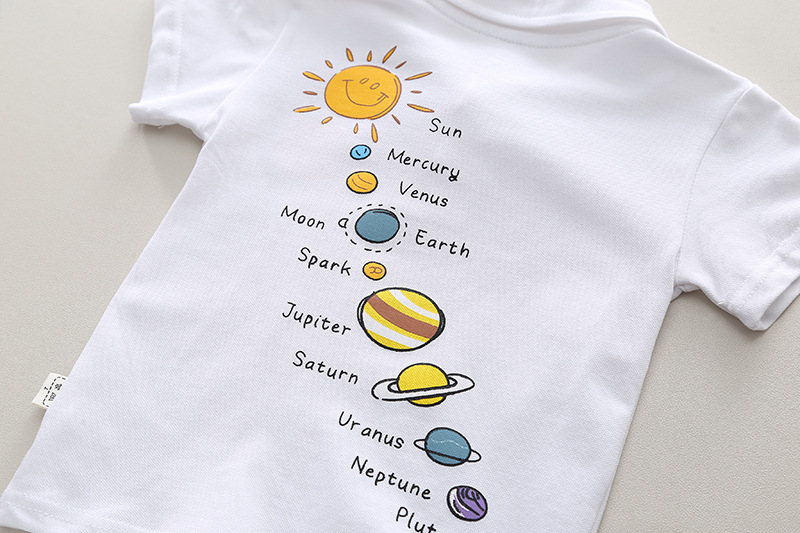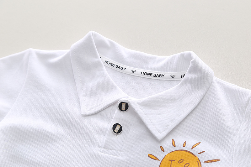 -Tricou realizat din material tip „Lacoste”, în culoare albă. Model cu croială standard și guler clasic, cu doi nasturi frontali pentru îmbrăcare ușoară. În față este decorat cu un soare zâmbitor, iar spatele tricoului prezintă o întreagă ilustrație cu planetele din Sistemul Solar.