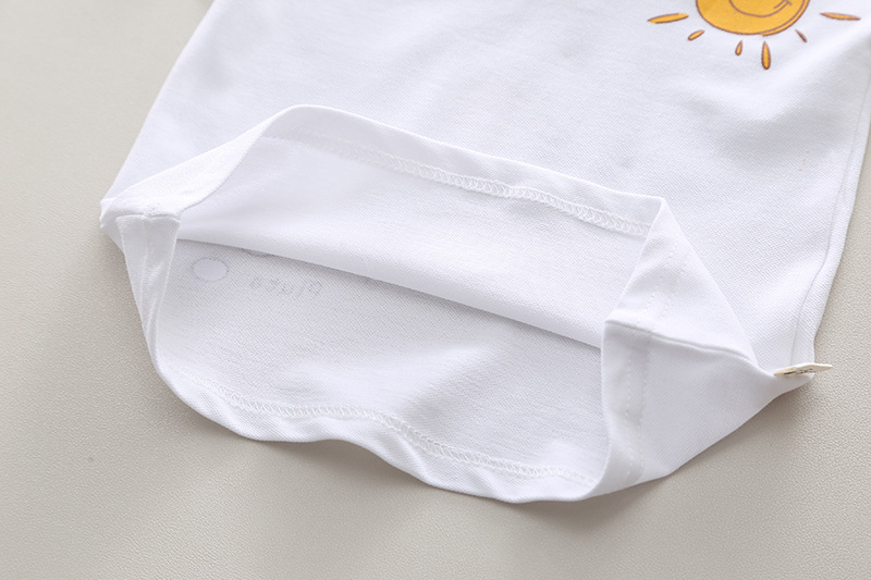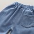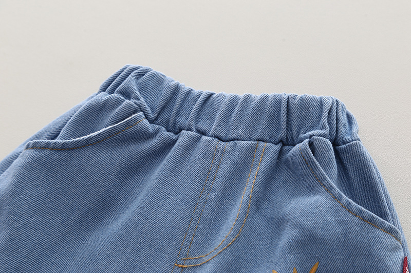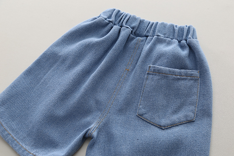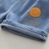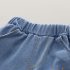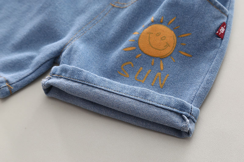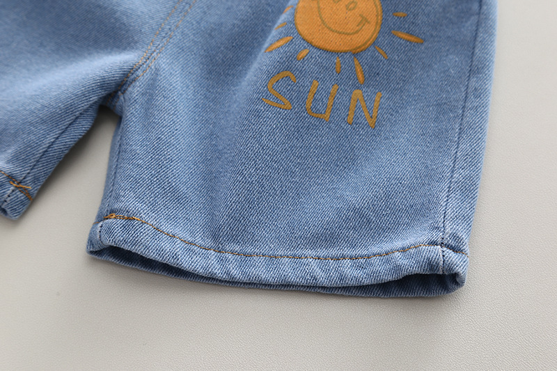 -Pantaloni scurți din denim, de culoare albastră, cu talie elastică confortabilă și buzunare laterale. În față, o imprimare cu un soare zâmbitor și inscripția „SUN”, în ton cu tricoul – pentru un set complet.