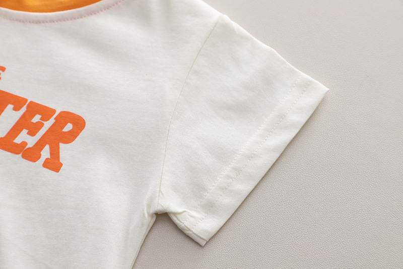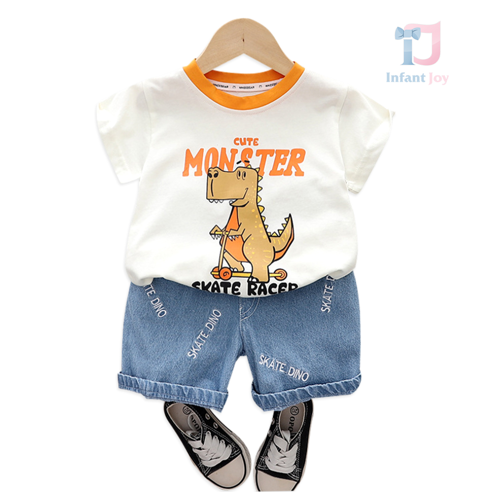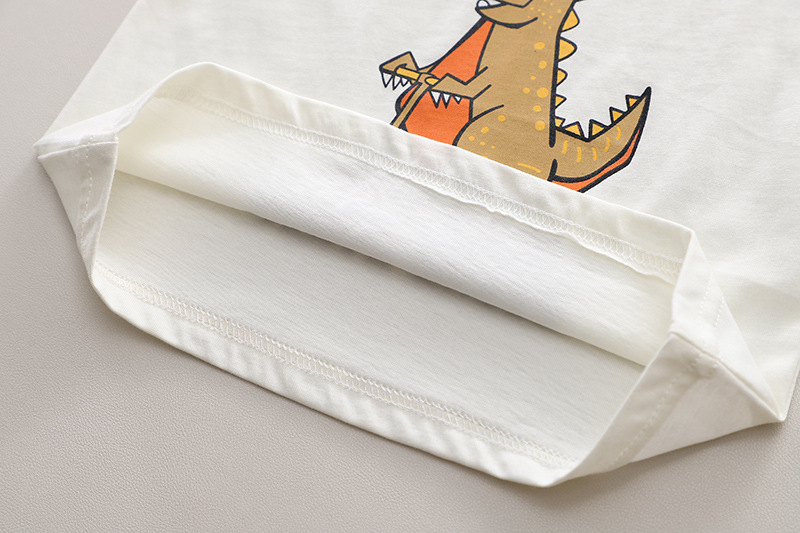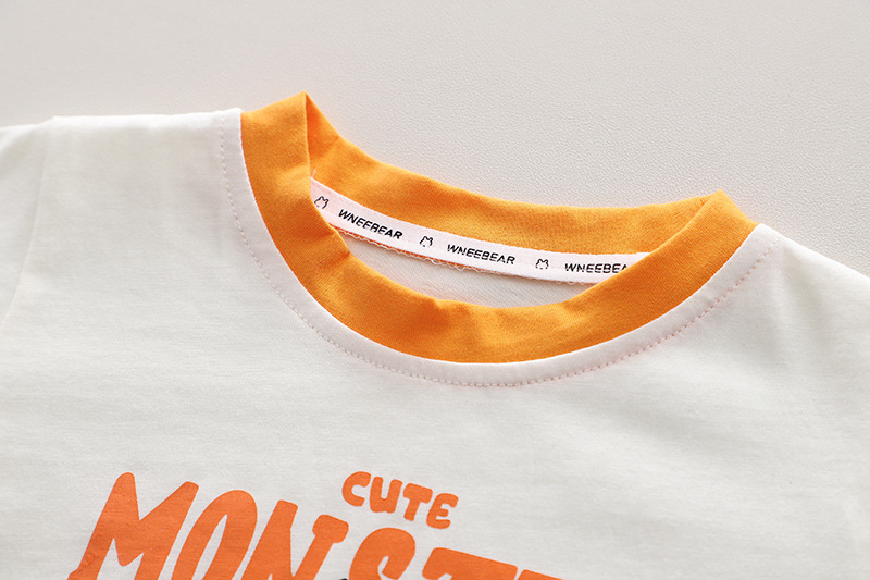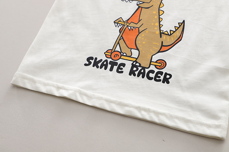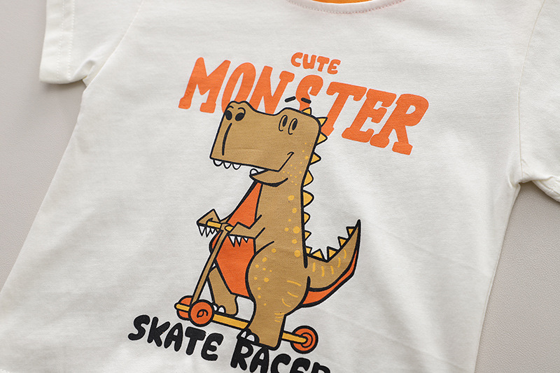 – Tricou cu mânecă scurtă, confecționat din bumbac de calitate superioară, în culoare crem cu guler contrastant portocaliu. Modelul este decorat cu un imprimeu mare și amuzant cu un dinozaur pe trotinetă, însoțit de textele „Cute Monster” și „Skate Racer”, ce adaugă un accent modern și jucăuș. Croiala lejeră oferă confort pe tot parcursa zilei.