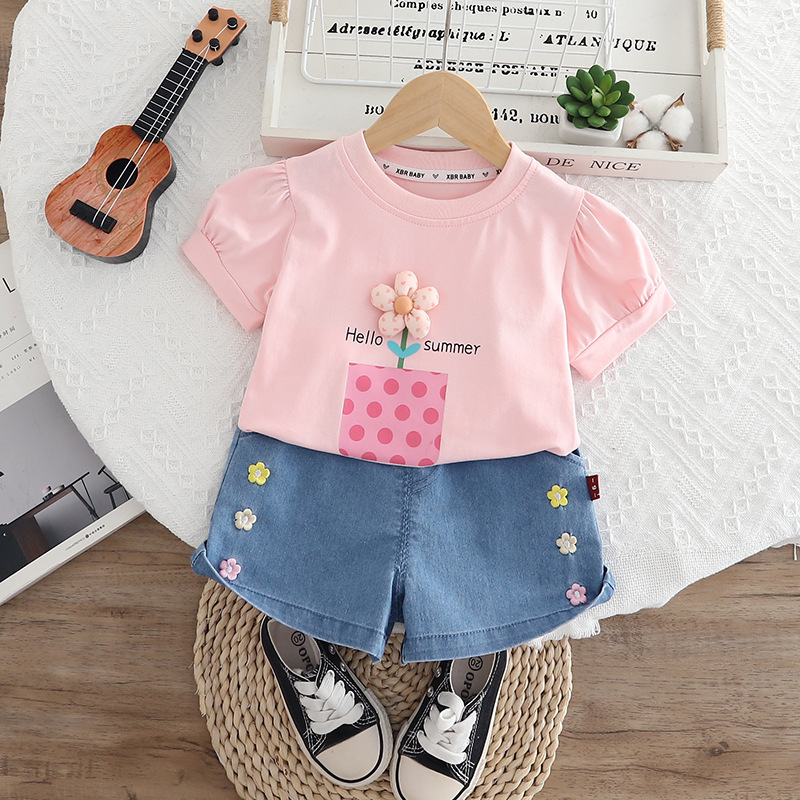 • Set de 2 piese cu tricou cu mâneci bufante, element 3D și pantaloni scurți cu broderii Hello Flowerday