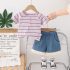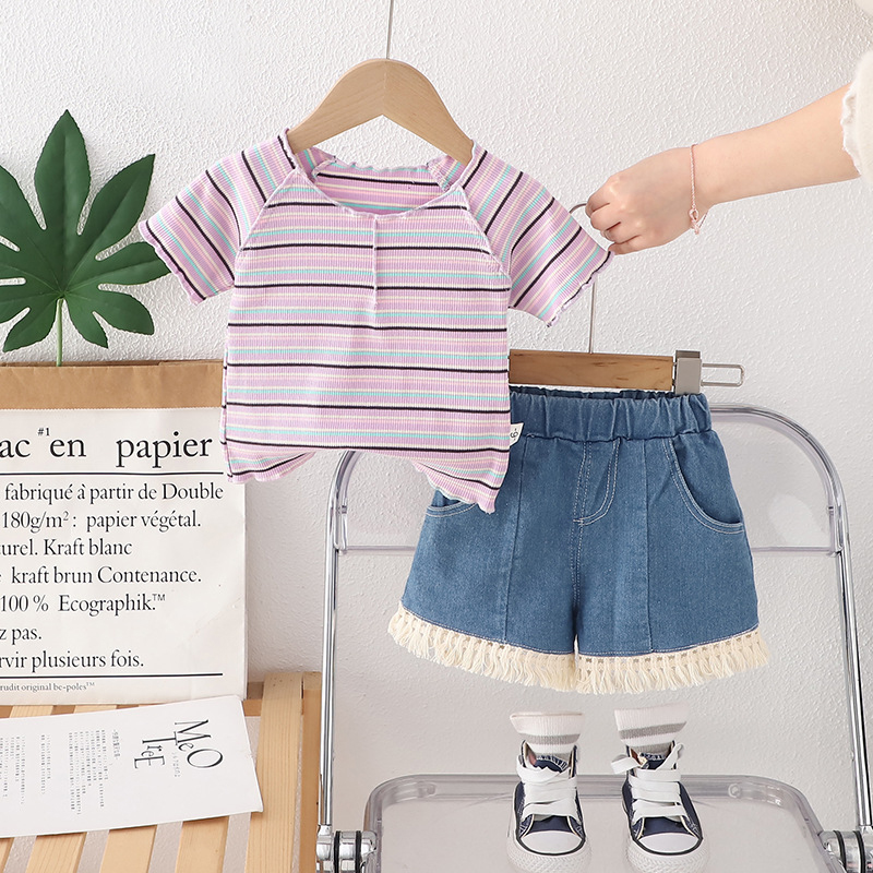 Set de 2 piese cu tricou în dungi și pantaloni scurți din denim cu ciucuri boho Riviera Stripes Violet