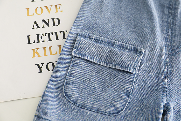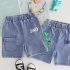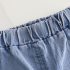 -Pantaloni scurți din denim albastru clasic, cu talie elastică și buzunar frontal practic, decorați și ei cu elemente 3D pe un crac.