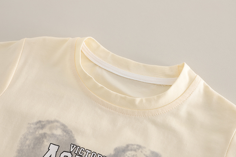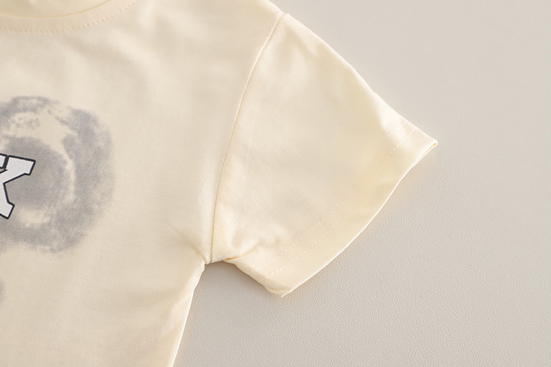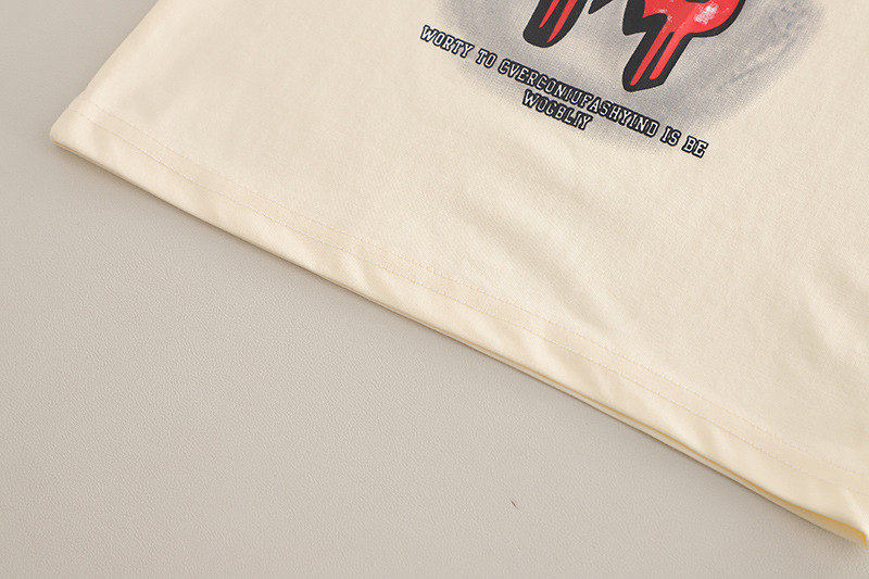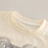 – Tricou cu mânecă scurtă, realizat din material moale, ușor elastic, în nuanță de vanilie. Croială lejeră, decorată cu un imprimeu mare în partea frontală.