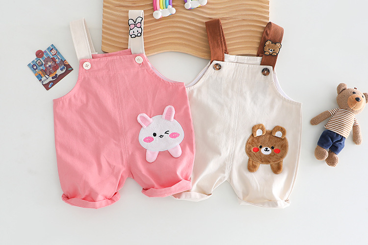 -Salopetă din bumbac mai gros, în culoare bej. Bretele reglabile maro, prinse în față cu două nasturi. Pe una dintre bretele se află o aplicație pufoasă în formă de ursuleț maro, iar pe un crac este cusută o aplicație mare, de asemenea pufoasă.