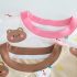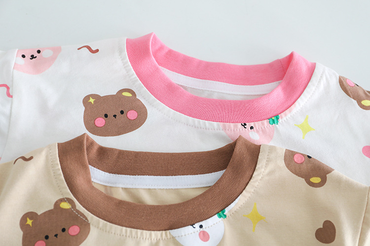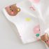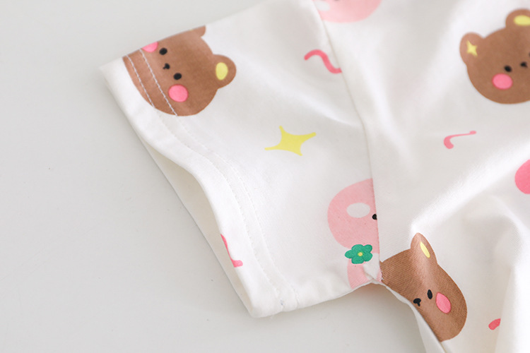 -Tricou din material rezistent, cu elasticitate ușoară, în culoare albă. Croială lejeră, decorat cu imprimeuri dispersate cu fețe zâmbitoare de ursuleți și iepurași. Mâneci scurte și guler rotund, finisat delicat în roz.