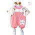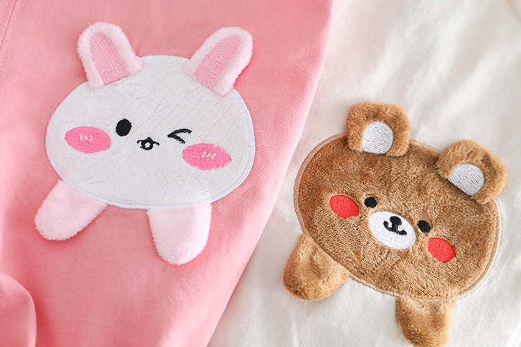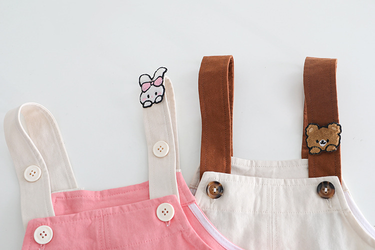 -Salopetă realizată din bumbac mai gros, în nuanță roz. Bretele reglabile prinse în față cu două nasturi. Pe una dintre bretele este cusută o mică aplicație cu iepuraș, iar pe un crac se află o aplicație mare și pufoasă.