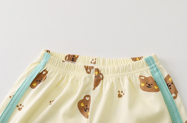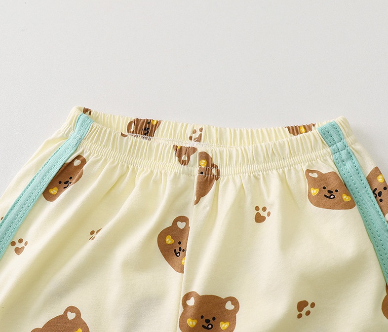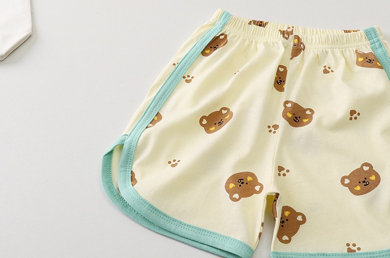 -Pantaloni scurți în melanj crem, cu talie elastică pentru îmbrăcare ușoară și tivuri verzi. Model complet cu ursuleți și lăbuțe, care completează look-ul.