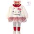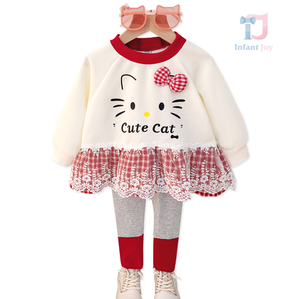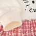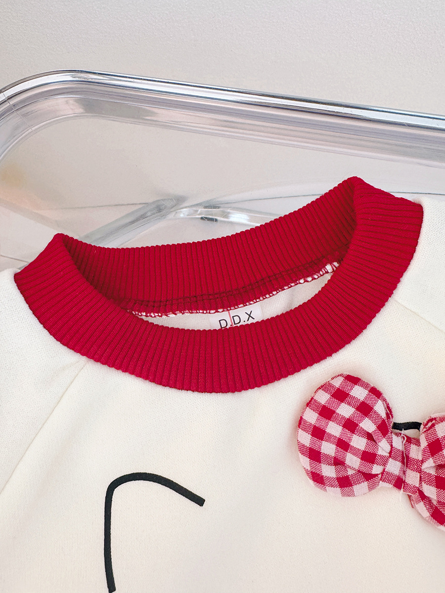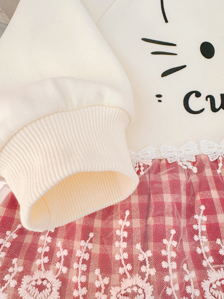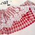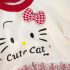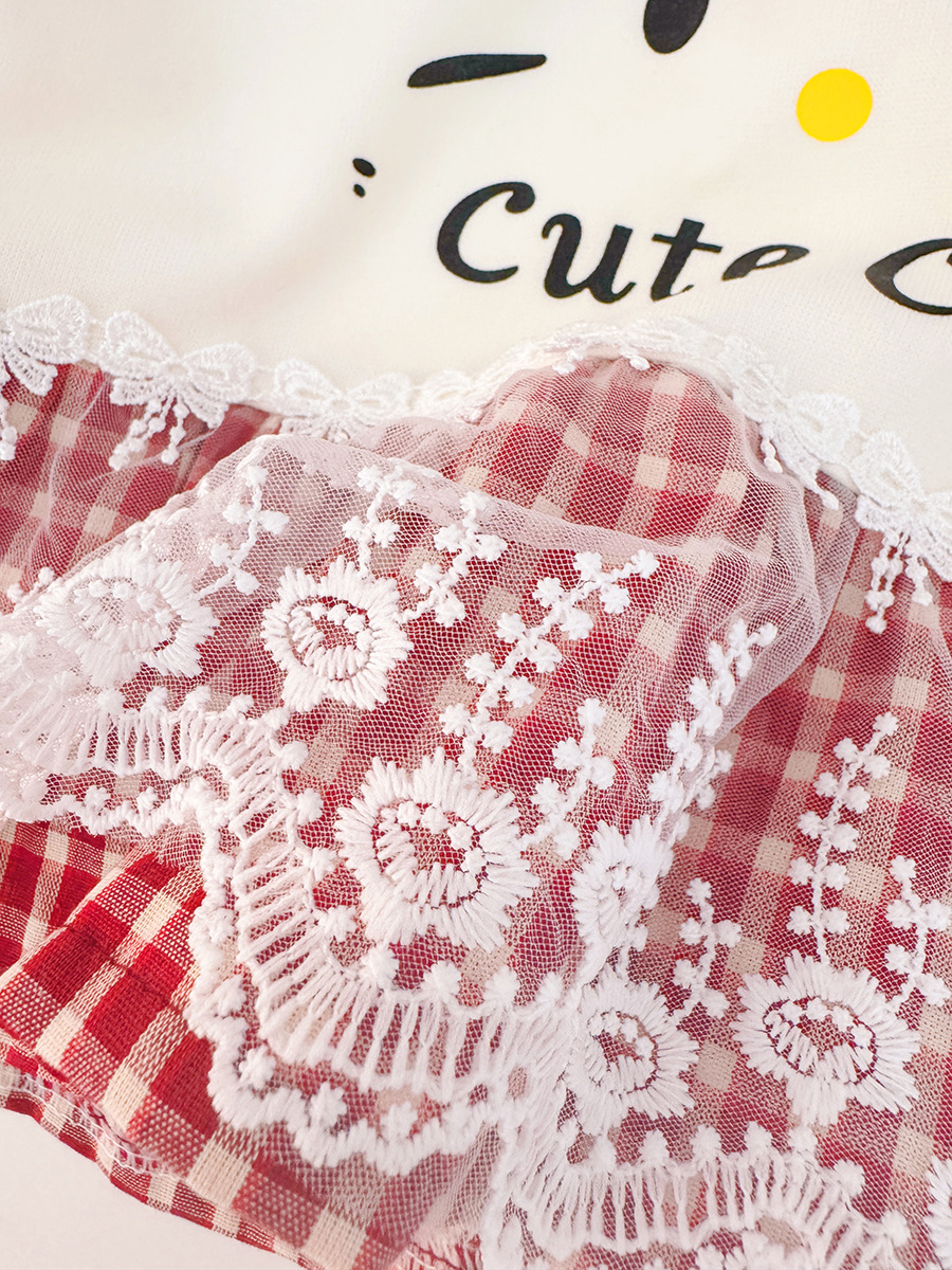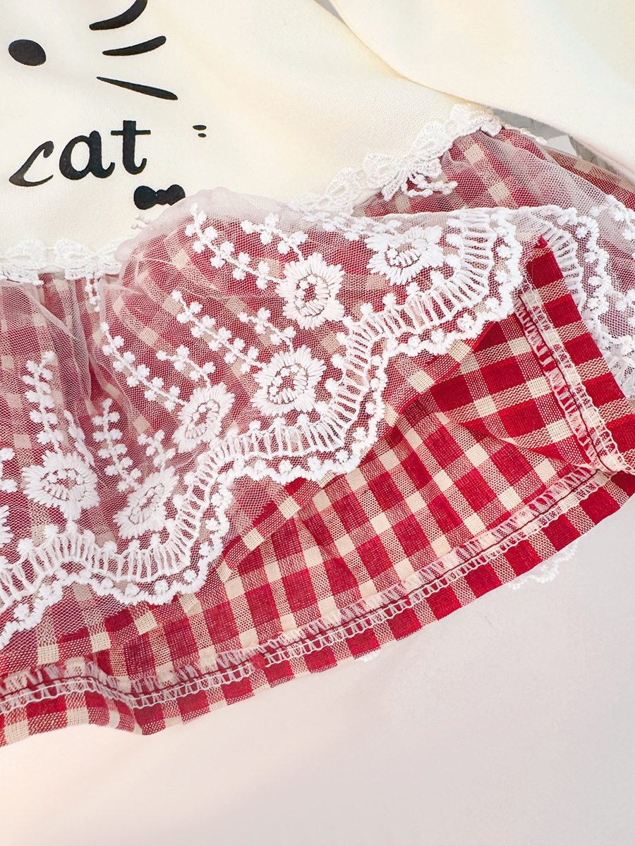 – Tunică din bumbac de calitate superioară, în alb lăptos. Model cu imprimeu vesel “Cute Cat”, completat cu o fundiță 3D în carouri roșii. Accente din carouri roșii în partea de jos și dantelă albă adăugată, care evidențiază croiala.