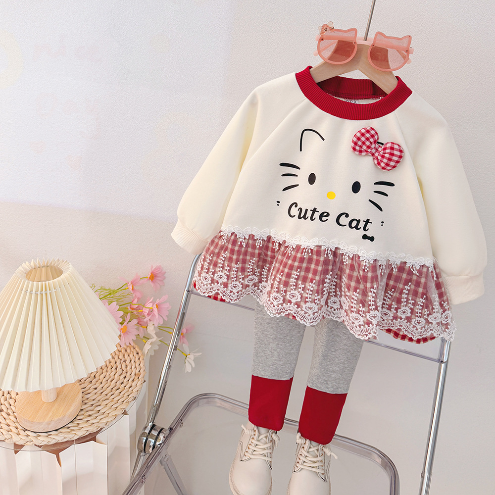 Set de 2 piese cu tunică cu dantelă, elemente 3D și colanți Cute Cat