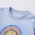 -Un top din bumbac de culoare albastru deschis. Model cu volane pe umeri, care conferă o eleganță de basm, iar croiala liberă nu restricționează mișcările. Decorat cu o imprimare cu un curcubeu colorat și flori din față.
