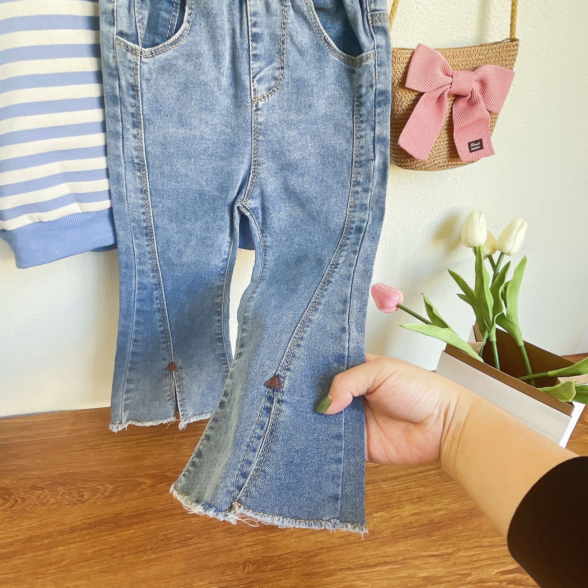 – Pantalon din denim tip evazat – model elegant, confecționat dintr-un material denim moale, cu croi evazat ce conferă un aspect retro modern. Cusăturile decorative și despicăturile din față subliniază linia pantalonului și oferă un finisaj elegant.