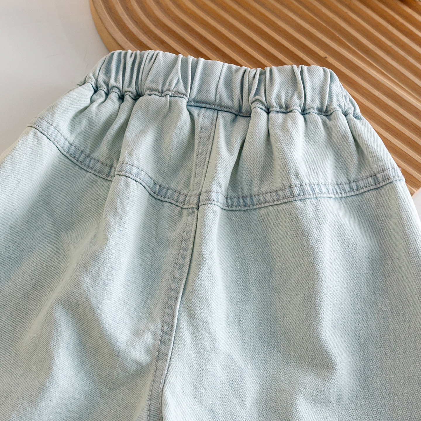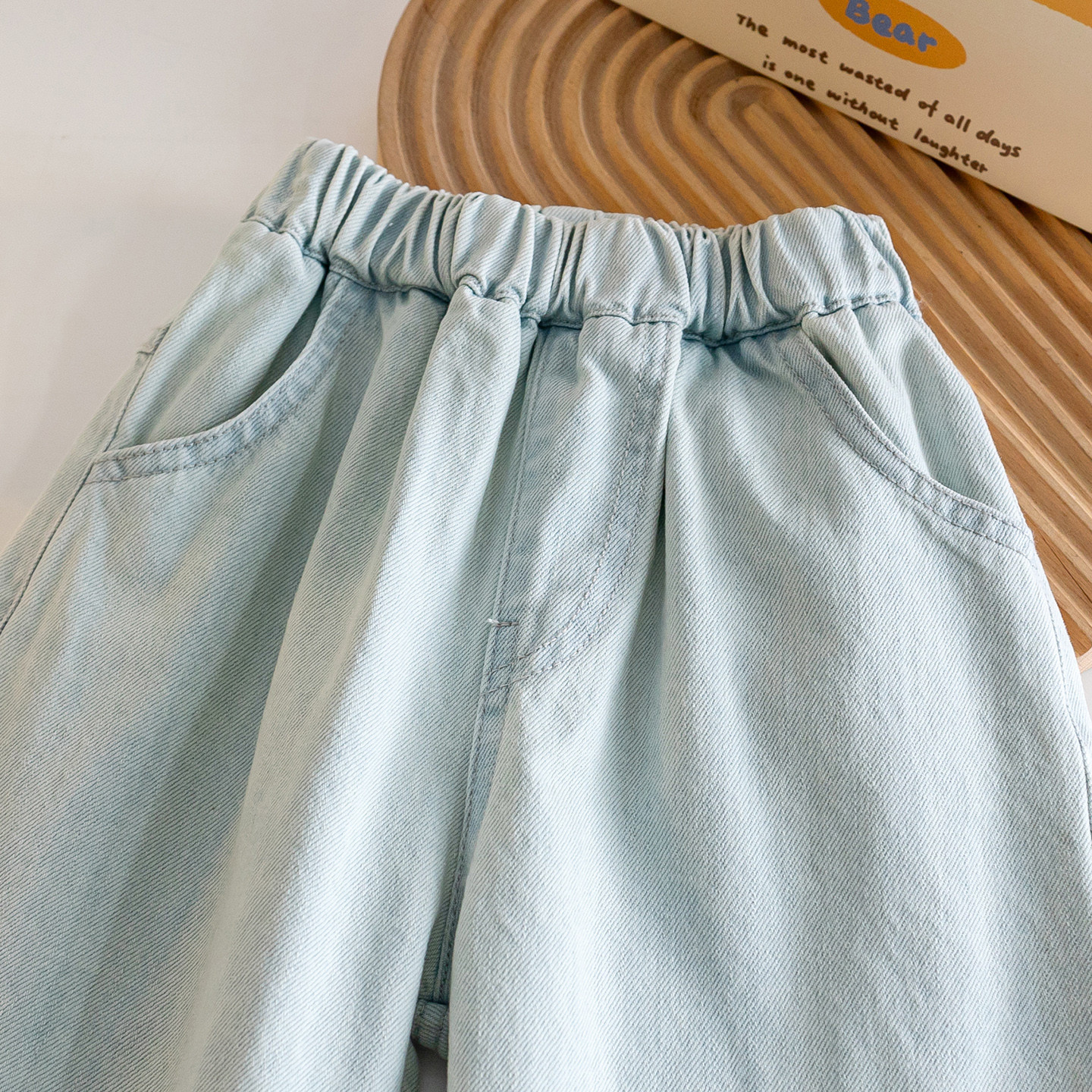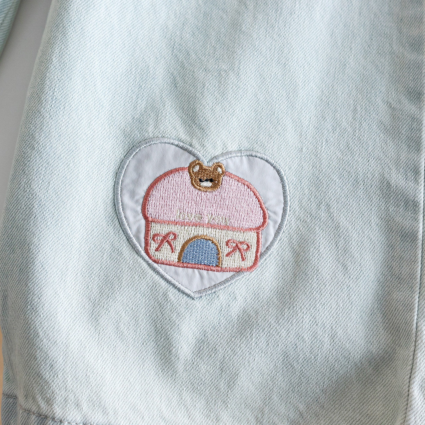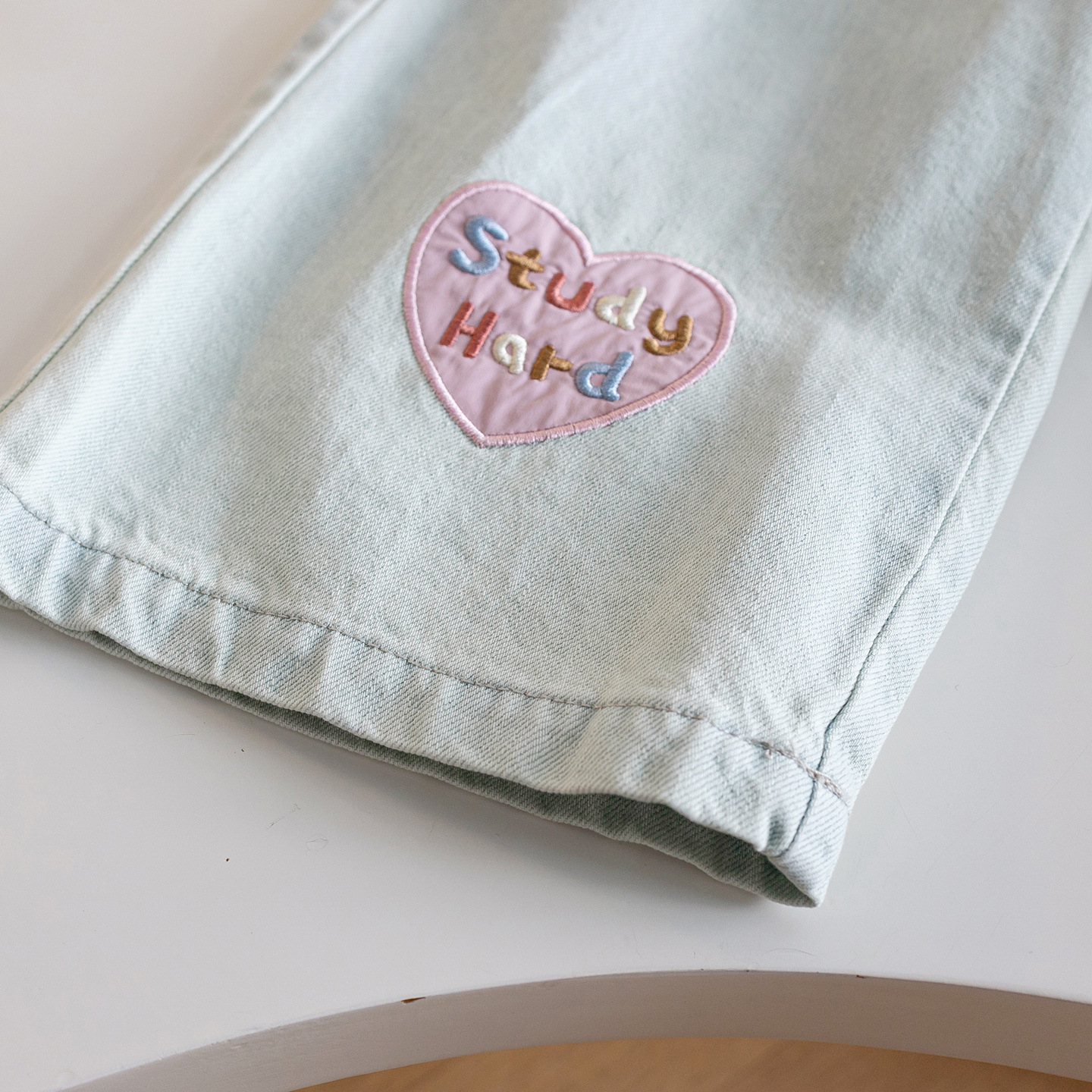– Pantalon din denim cu crac lung, realizat dintr-un material moale și confortabil, într-un ton pastelat, bleu-deschis. Modelul are talie elastică pentru îmbrăcare ușoară și confort sporit. Accentele sunt aplicațiile decorative în formă de inimioare cu inscripții și mici detalii, care completează ținuta cu un plus de farmec.