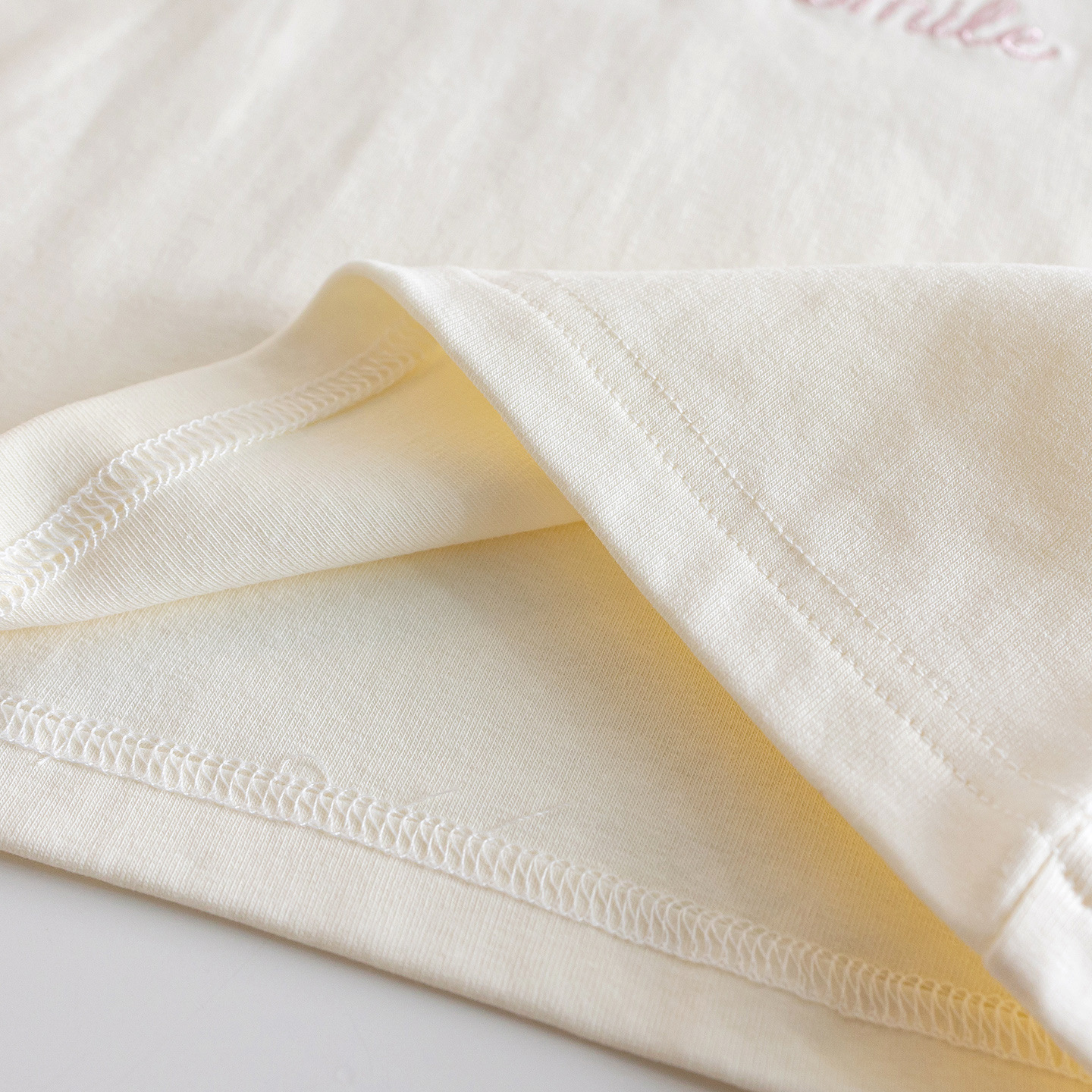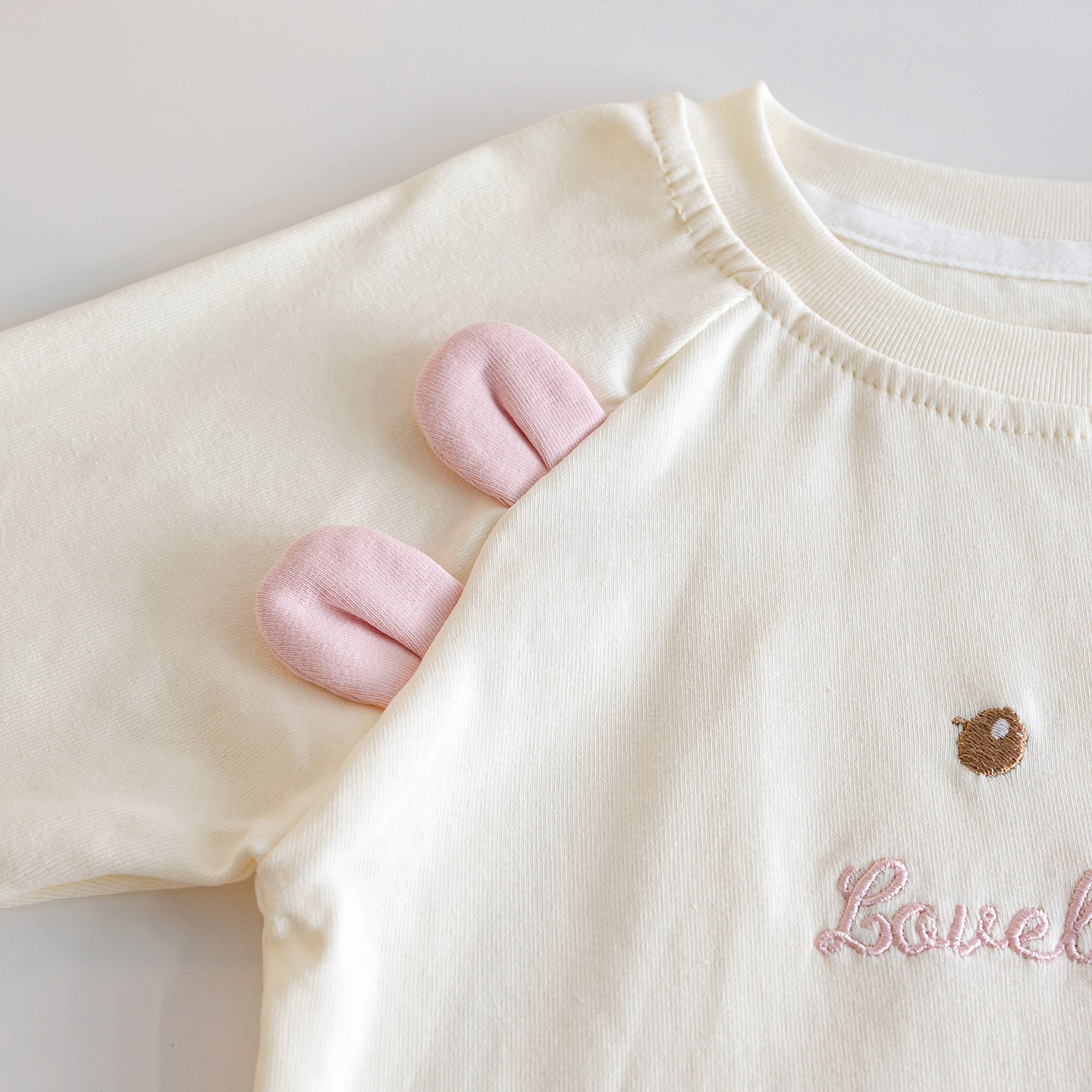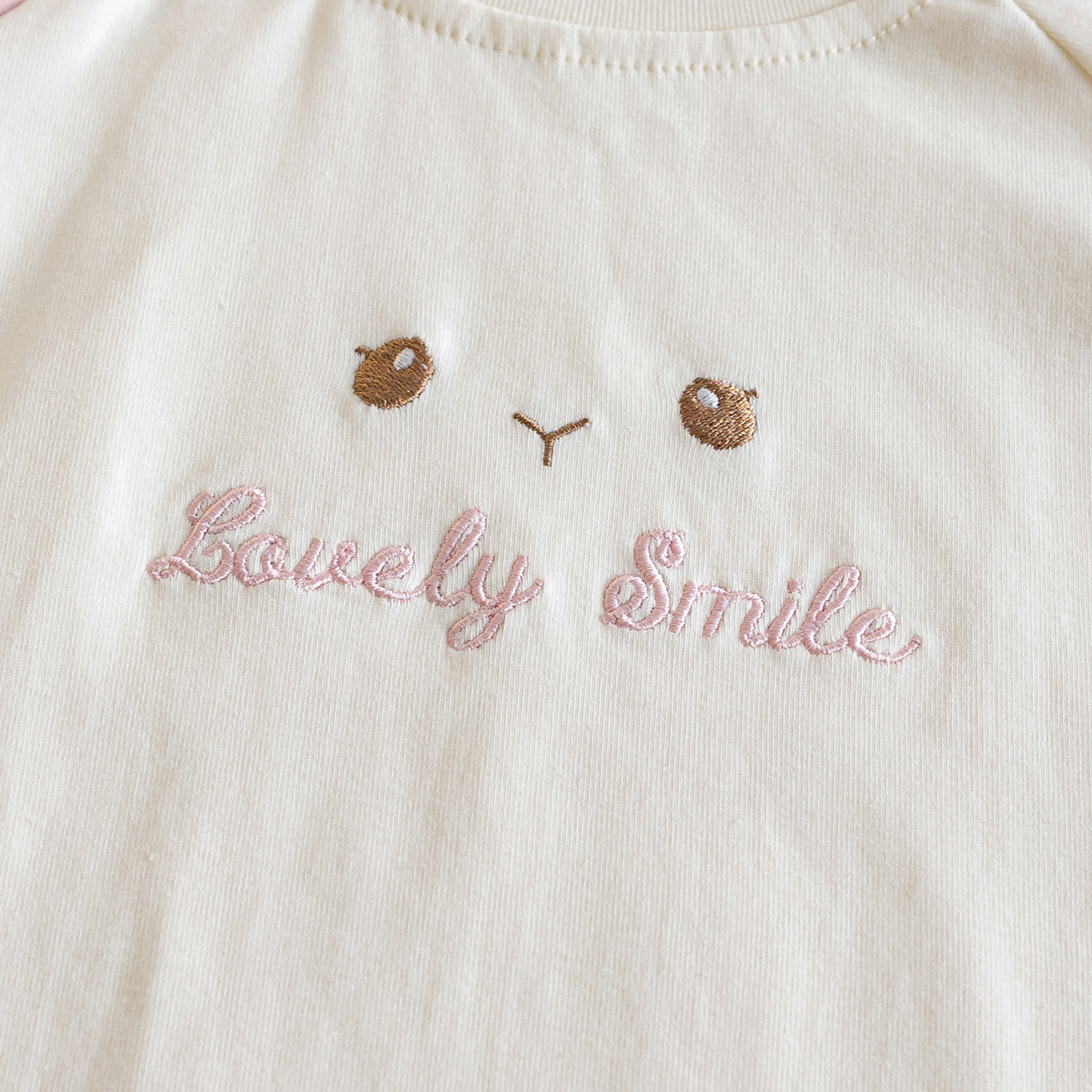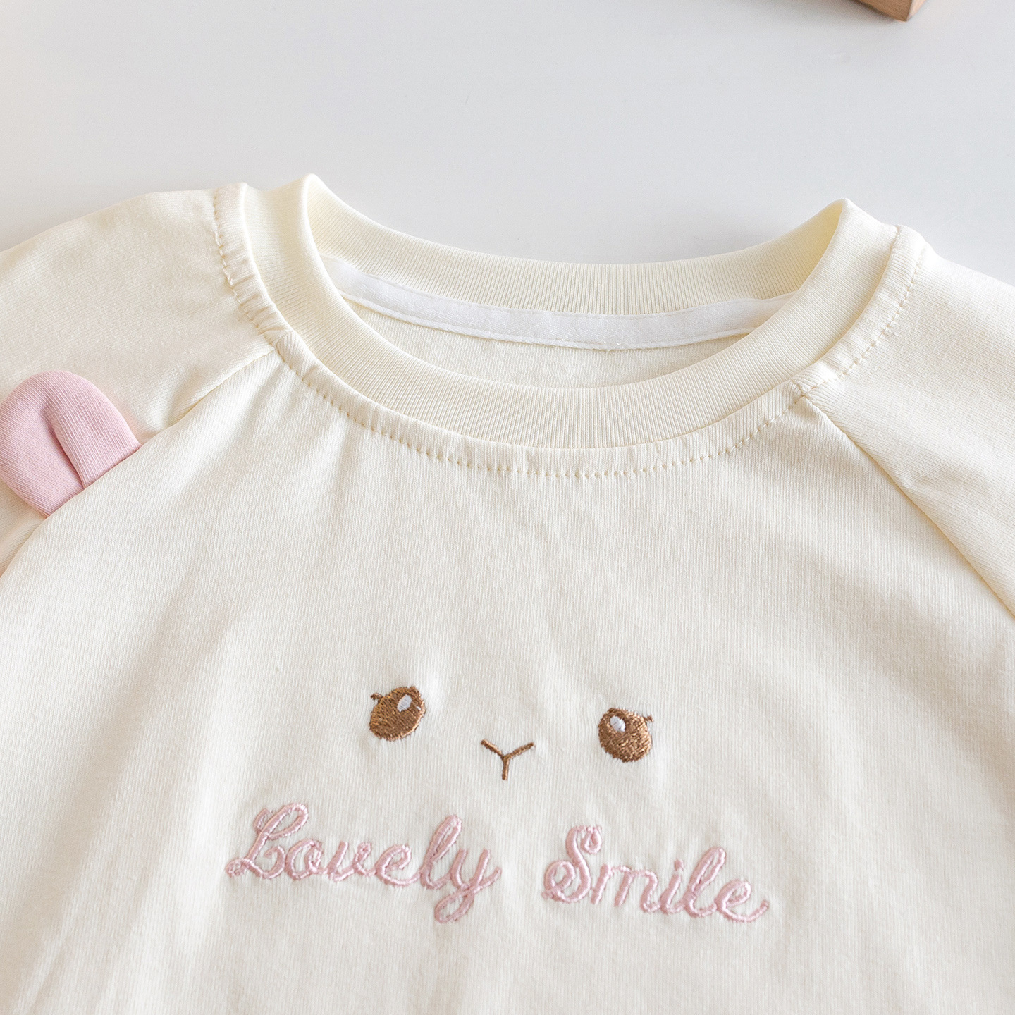 – Bluză cu mânecă lungă, confecționată dintr-un material moale și plăcut la atingere, din bumbac, într-o nuanță deschisă, crem. Modelul are decolteu rotund și croială lejeră pentru confort maxim. Accentele sunt reprezentate de urechiușele decorative din partea superioară, precum și de chipul drăgălaș cu inscripția “Lovely Smile”, care oferă un aspect jucăuș și delicat.