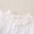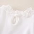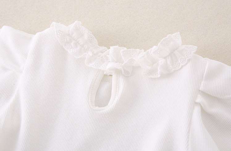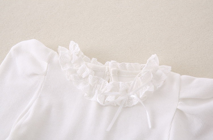 – Bluziță rib cu mânecă lungă și elasticitate, confecționată din material moale și plăcut la atingere, de culoare albă. Modelul are un guler dantelat cu volănașe elegante, completat de o mică fundiță decorativă în față. Mânecele au o ușoară formă bufantă în partea superioară, ceea ce conferă o siluetă rafinată și feminină.