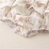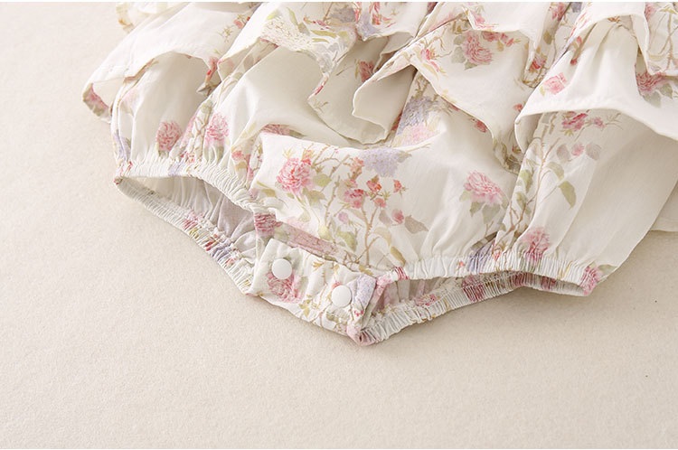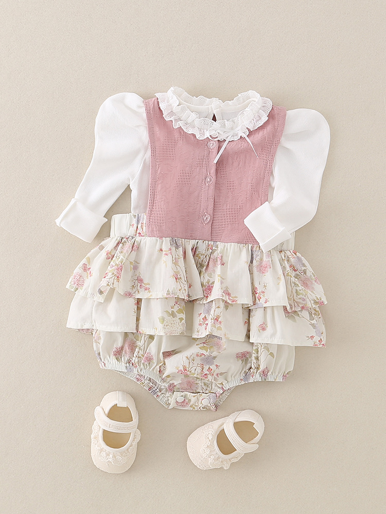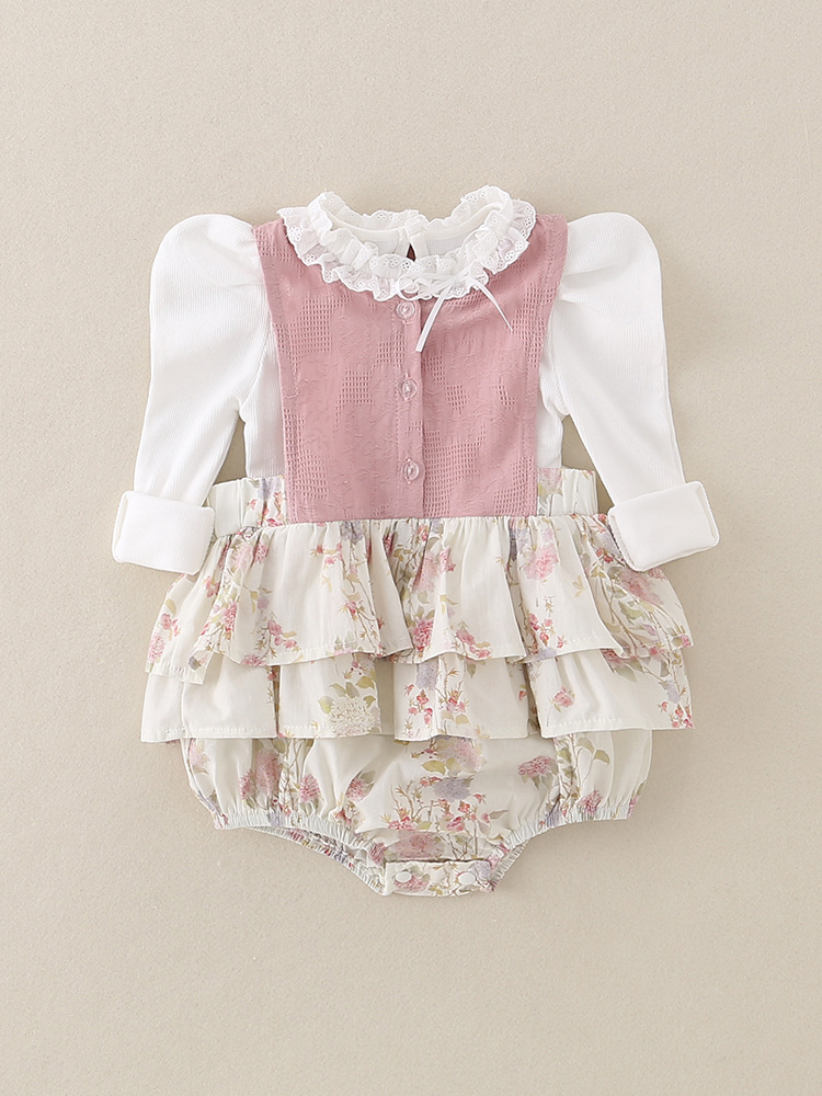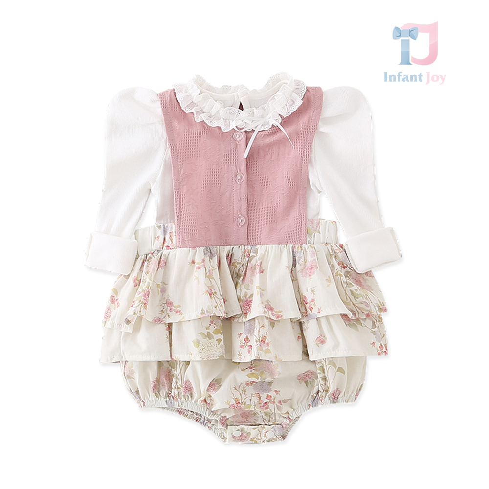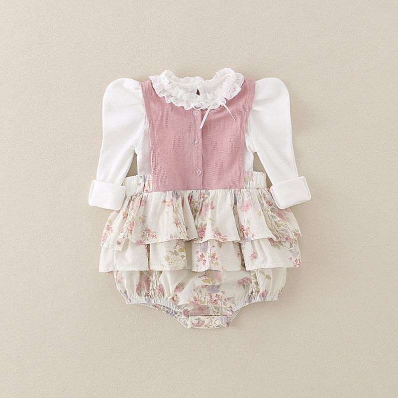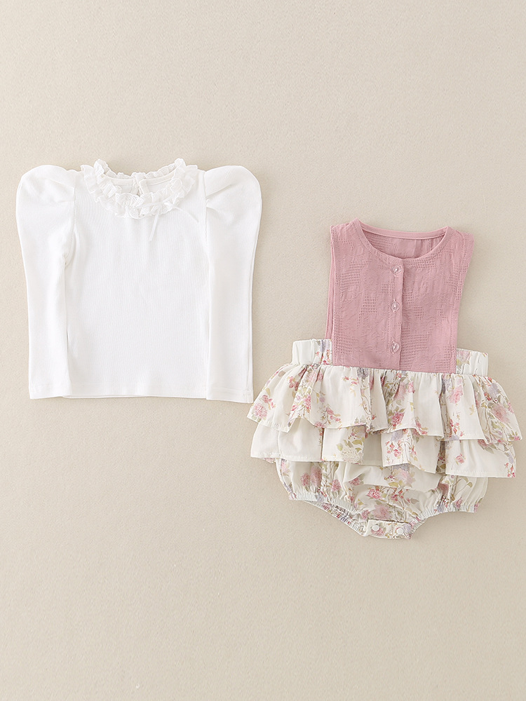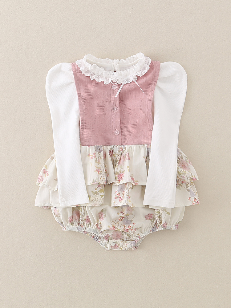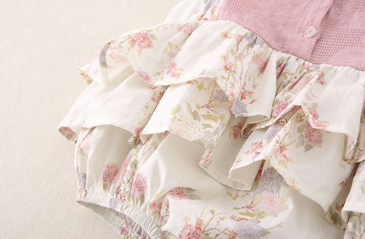 – Body cu partea superioară într-o nuanță delicată de roz pudrat, cu textură fină și închidere cu nasturi în față. Modelul are chiloțel integrat, confecționat din material ușor și confortabil, de culoare albă, cu un imprimeu floral delicat. Este prevăzut cu volănașe suprapuse în talie, care creează un efect de rochiță, și cu deschizături elastice pentru picioare, pentru un confort sporit. Închiderea în partea de jos facilitează schimbarea.