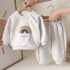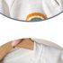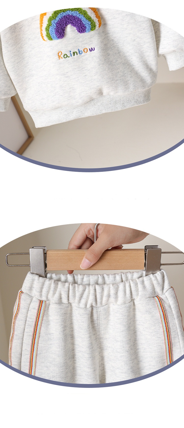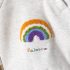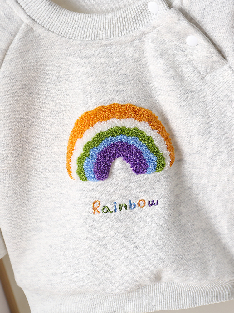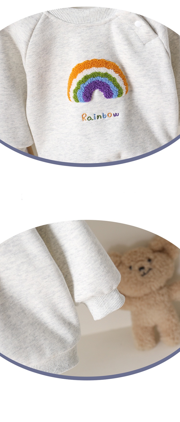 – Bluziță/hanorac – model comod, cu croială clasică și mâneci raglan, confecționat dintr-un melanj gri moale. Accentul este pus pe aplicația pufoasă Rainbow din față, care adaugă volum, textură și un aer drăgălaș. Închiderea practică cu nasturi pe umăr facilitează îmbrăcarea, iar manșetele și tivul moi asigură confort și o potrivire plăcută.