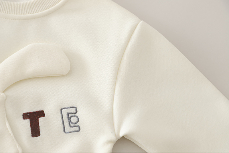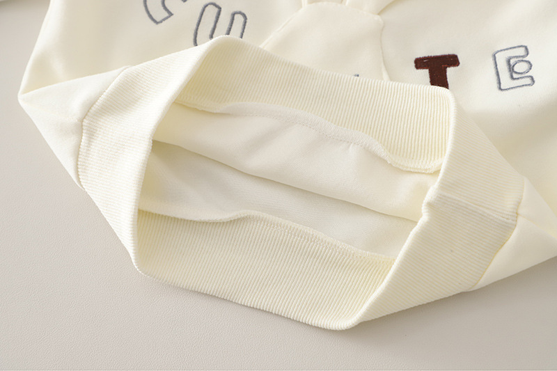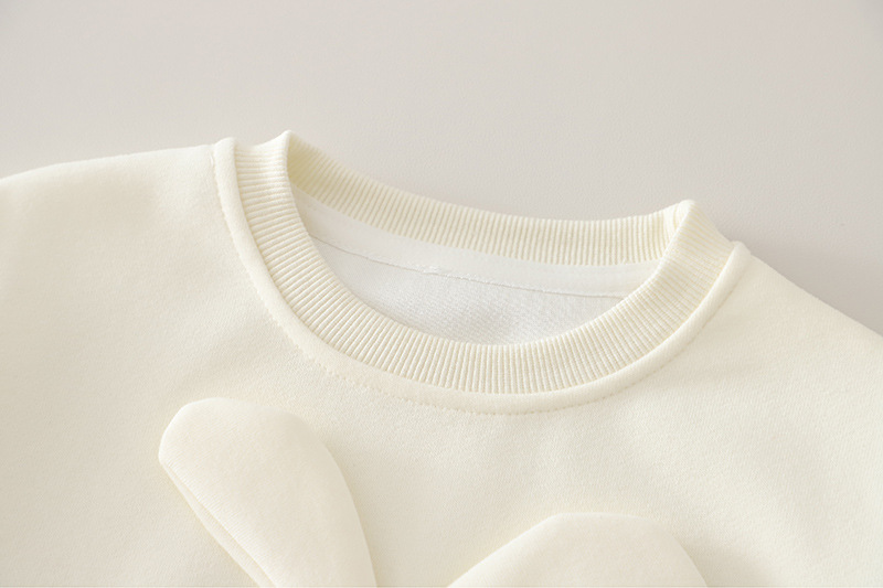 – Bluză tip hanorac, confecționată din material moale și plăcut la atingere, în culoare vanilie. Modelul are decolteu rotund, croială lejeră și manșete ripsate la mâneci și la tiv. Accentul este aplicația 3D mare cu iepuraș din față, completată de broderii cu inscripția „CUTE”, care oferă un aspect jucăuș și delicat. Mânecile pot fi îndoite pentru un stil mai relaxat și practic.