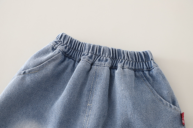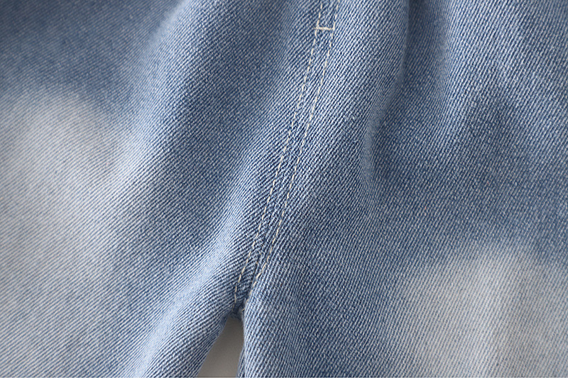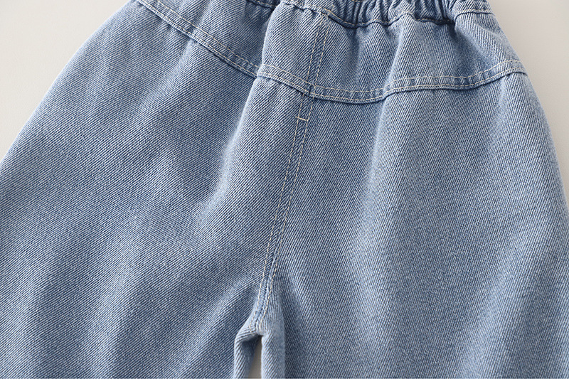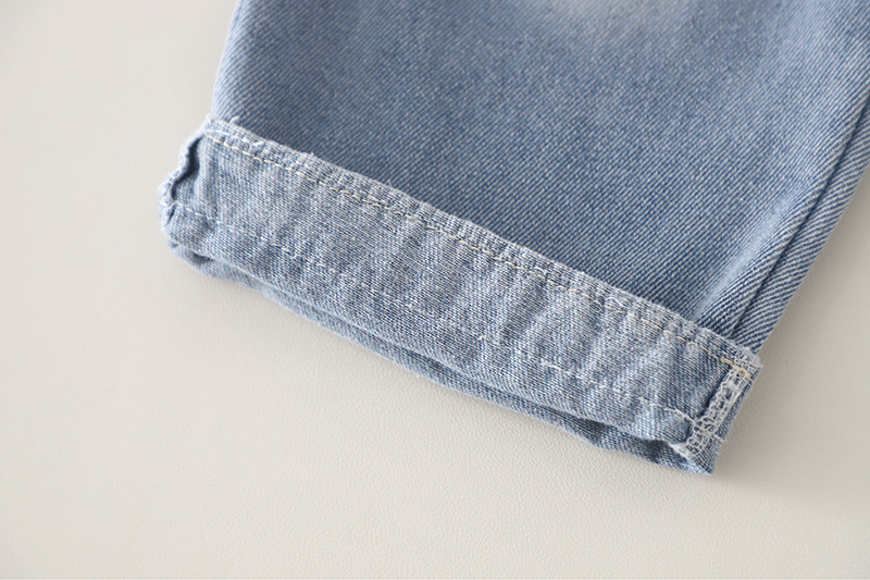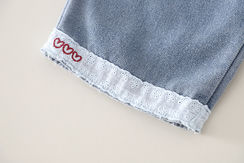 – Pantalon din denim, realizat din denim moale și confortabil, în nuanță deschisă de albastru. Modelul are talie elastică pentru îmbrăcare ușoară, croială dreaptă și lejeră, iar în partea de jos se află elemente din dantelă cu mici broderii decorative, care completează ținuta cu un detaliu fin.