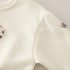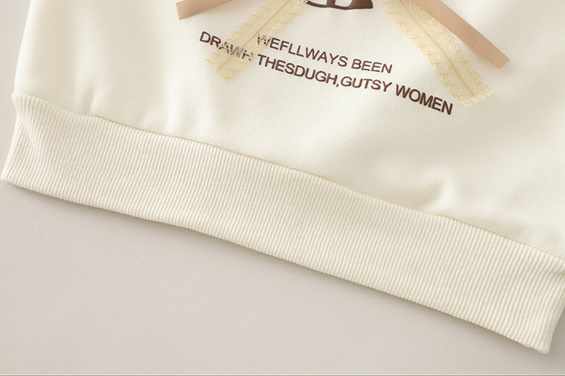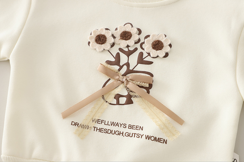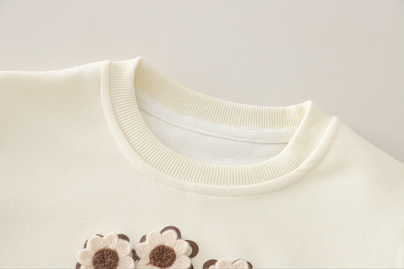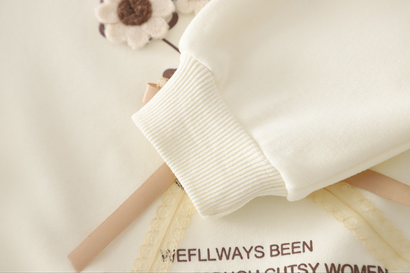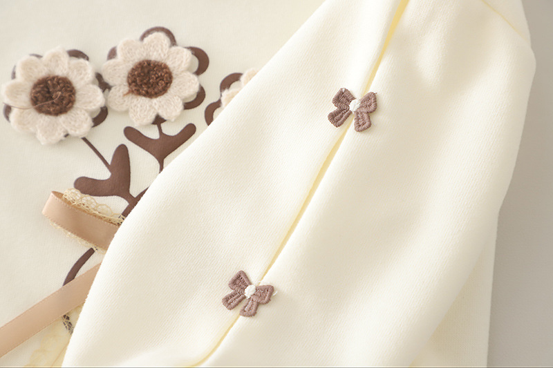– Bluză/hanorac în culoare ecru, din material de bumbac. Model cu imagine colorată frumoasă și aplicații de flori 3D și fundiță în față. Mânecele decorate adaugă un plus de delicatețe și stil. Manșete elastice pentru o potrivire confortabilă. Potrivită pentru purtare zilnică.