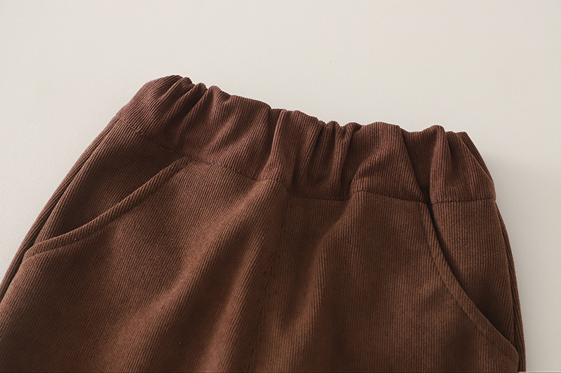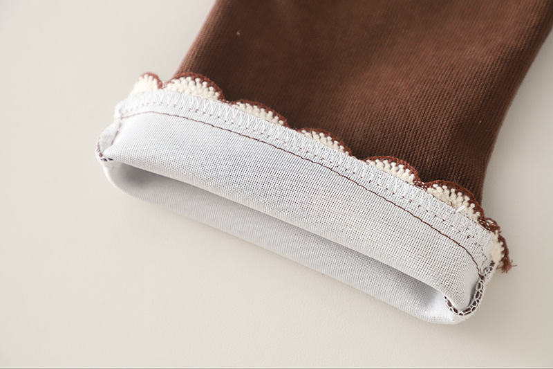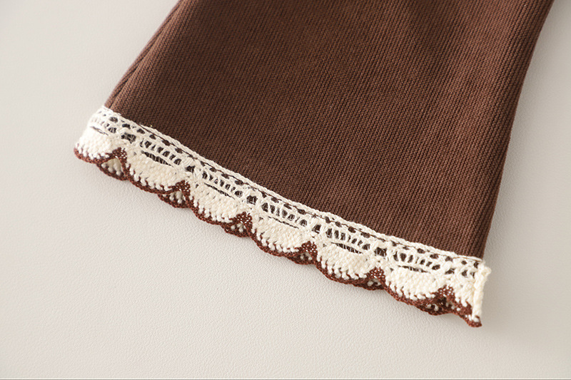 – Pantalon din catifea reiată, în culoare maro închis modernă, cu dantelă fină la tiv, care oferă un finisaj delicat și romantic. Talie elastică pentru confort la îmbrăcare și purtare.