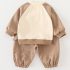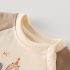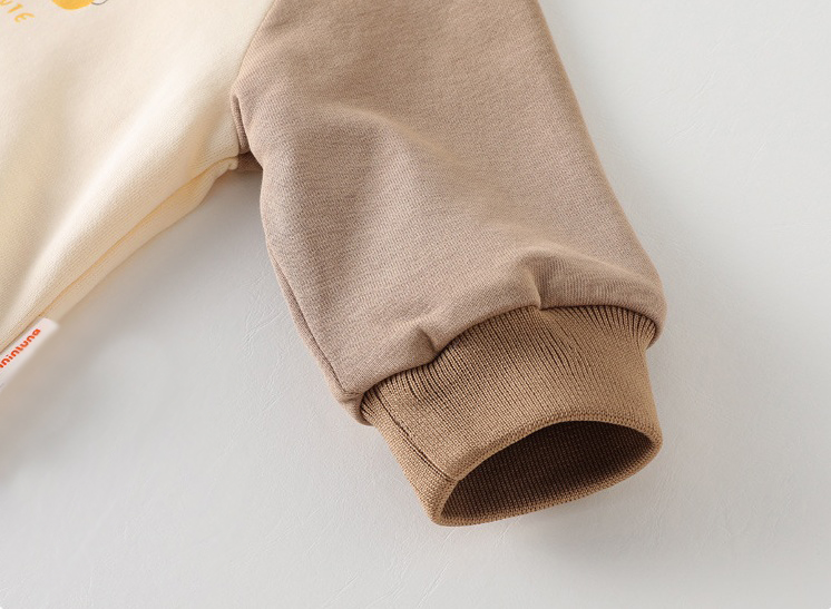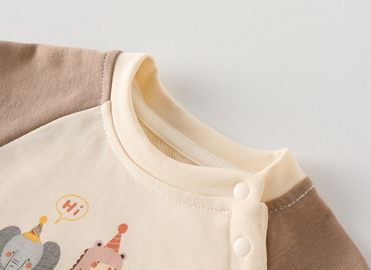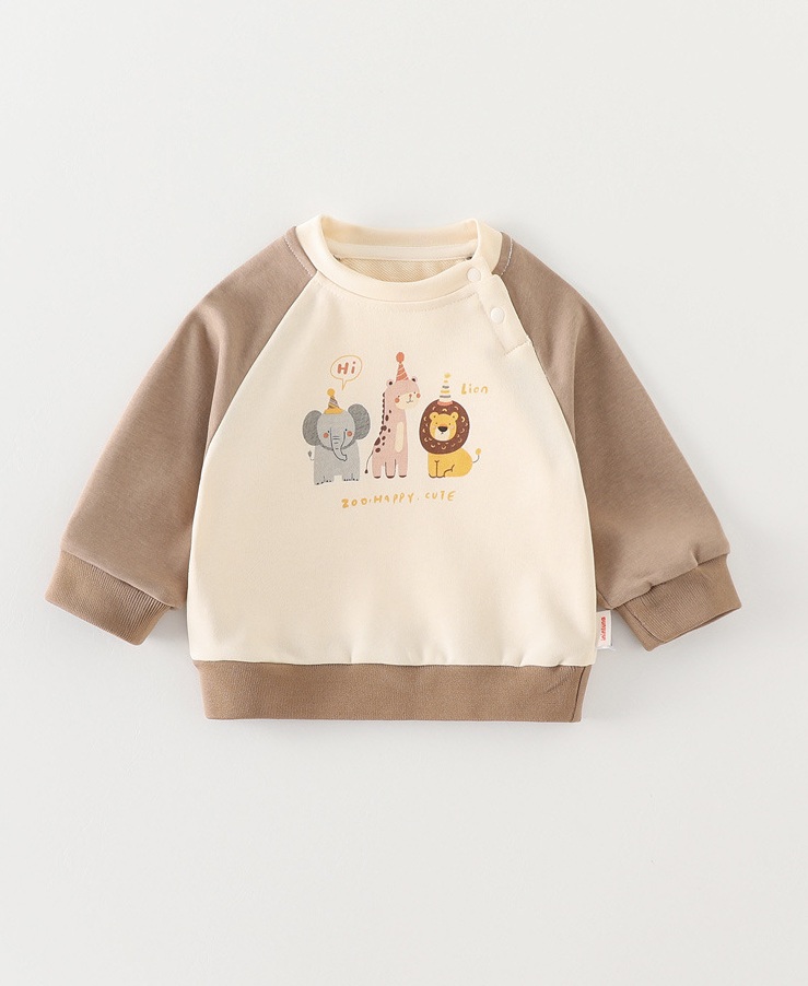 – Bluziță/hanorac din material moale, din bumbac. Model cu croială clasică, mâneci raglan într-o culoare contrastantă și caldă, închidere practică cu nasturi pe umăr pentru îmbrăcare ușoară și o imprimare fină cu animăluțe în față.
