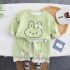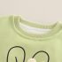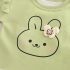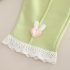 -Bluză/hanorac din bumbac, verde pastel, cu decolteu rotund și manșetă elastică tip rib. Decorată cu un imprimeu jucăuș cu iepuraș, volănașe vaporoase pe umeri și o fundiță 3D brodată, aplicată delicat pe o urechiușă. Tivul este accentuat cu dantelă albă pentru un plus de finețe.