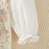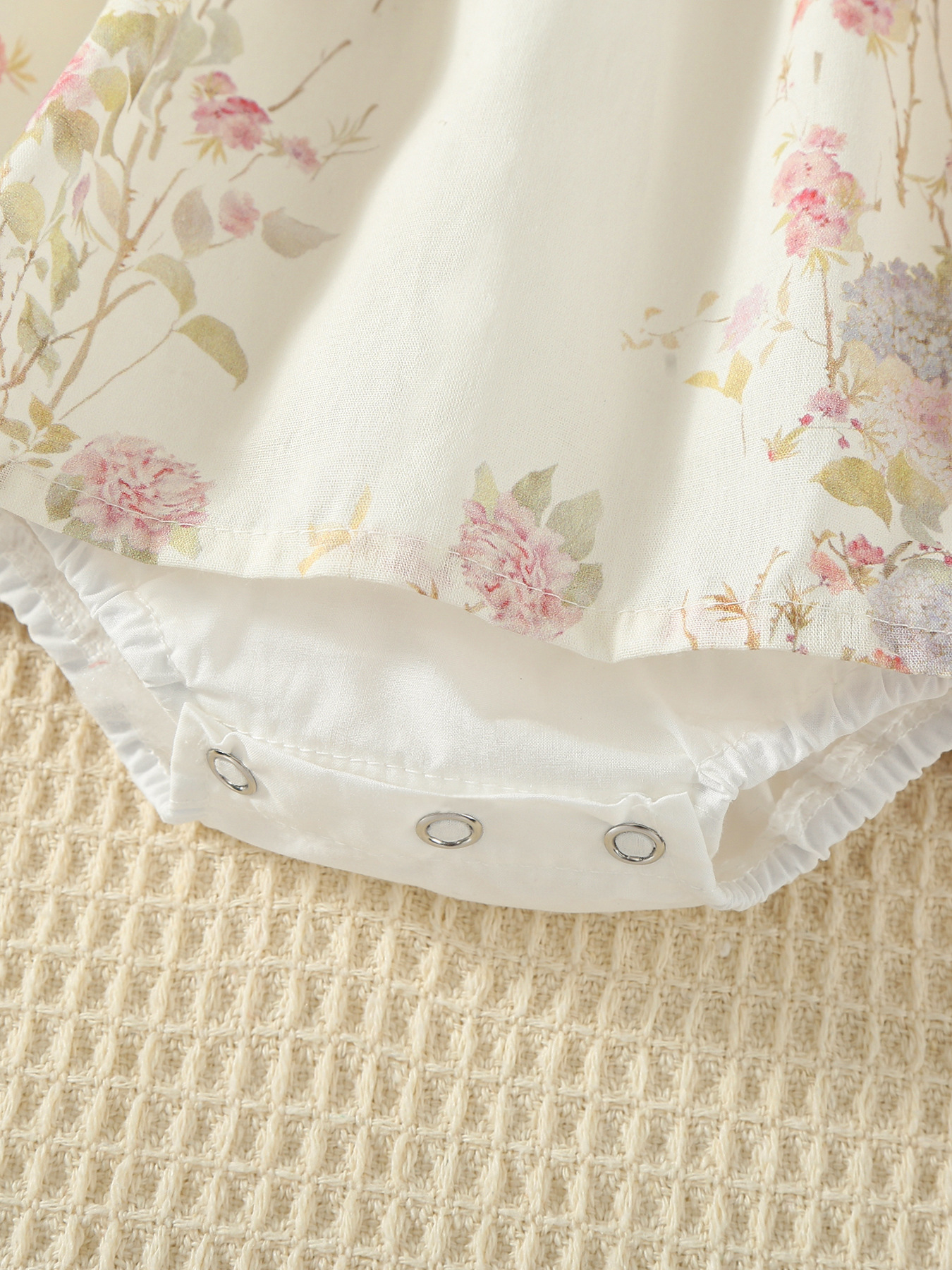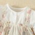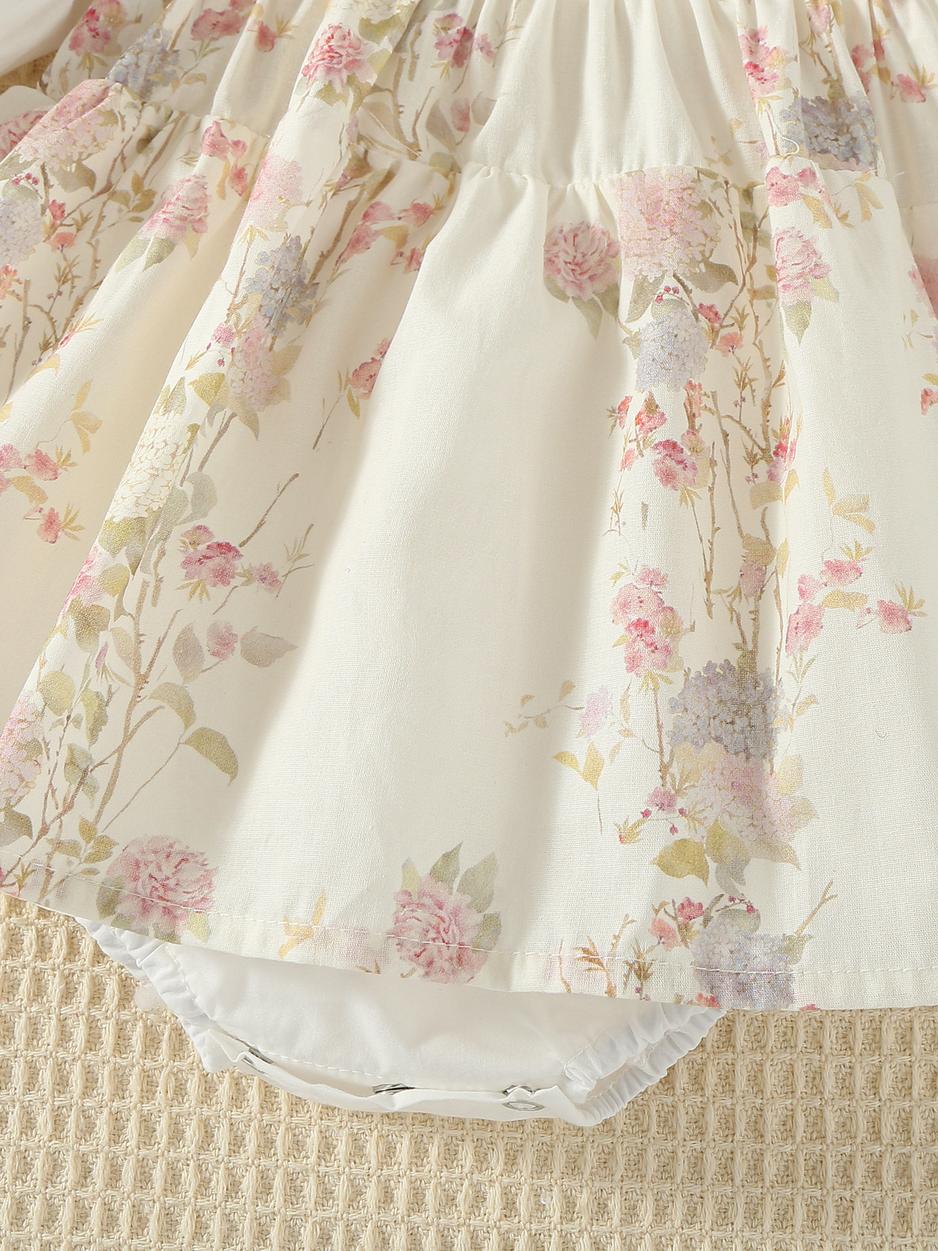 – Rochiță-body cu mânecă lungă, confecționată dintr-un material moale și plăcut la atingere. Partea superioară este într-o nuanță albă simplă, cu decolteu rotund și mâneci ușor încrețite, prevăzute cu manșete elastice. Partea inferioară este concepută ca o rochiță cu un imprimeu floral diafan în tonuri pastelate, cu bretele și un ușor fald care oferă volum și un aspect de poveste. Body-ul integrat, cu capse tip tic-tac, asigură confort la îmbrăcare și schimbare.