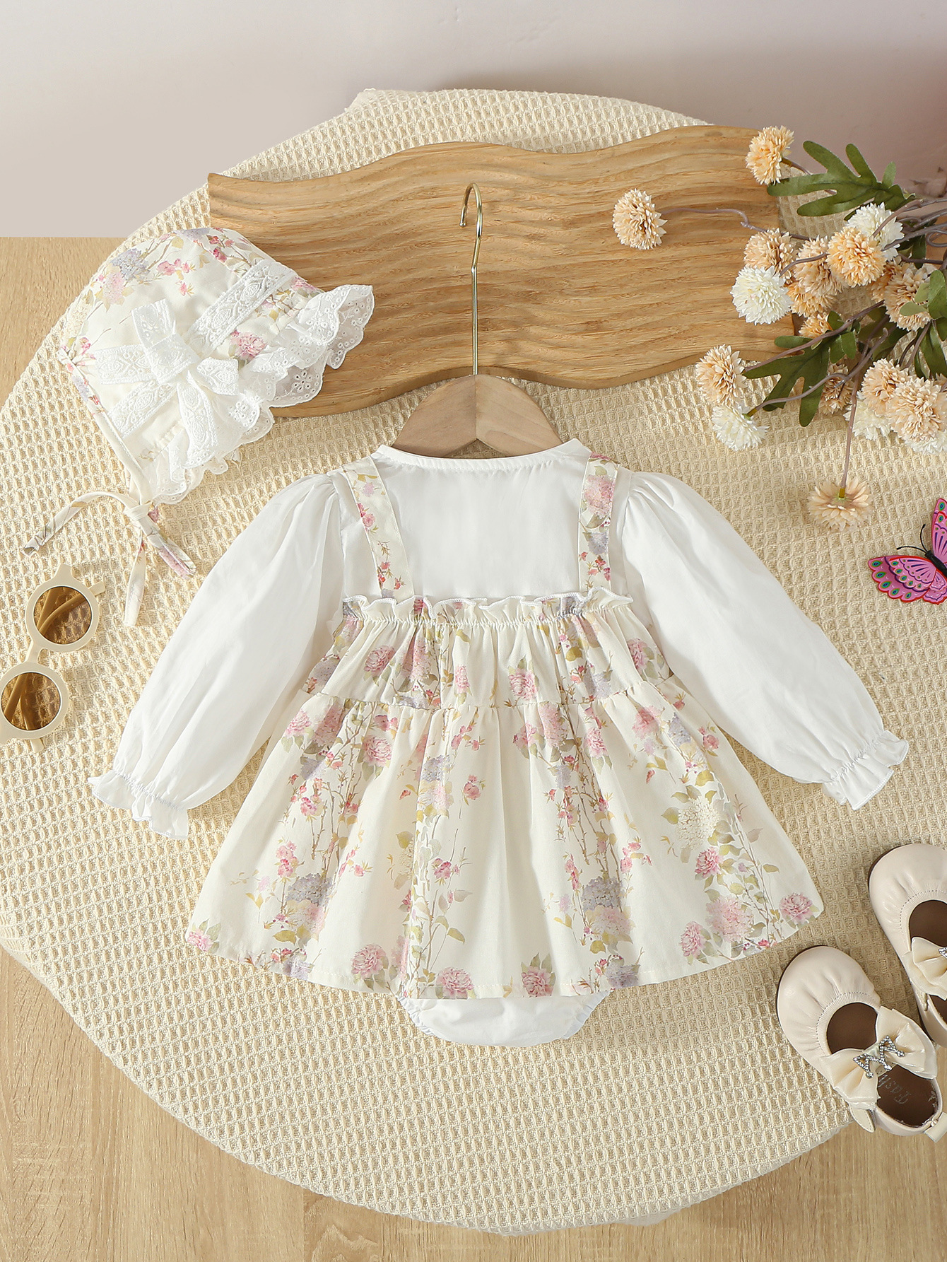 🌸 Rochiță-body delicată cu pălărie pentru fetiță – diafană, romantică și creată pentru cele mai dulci momente. O ținută rafinată, cu un model floral delicat și un aer vintage.