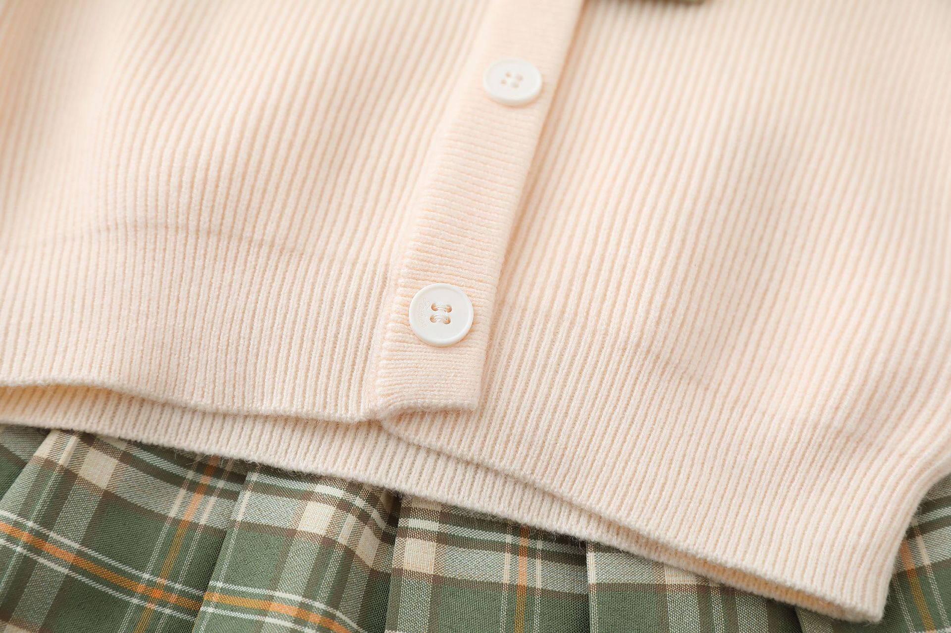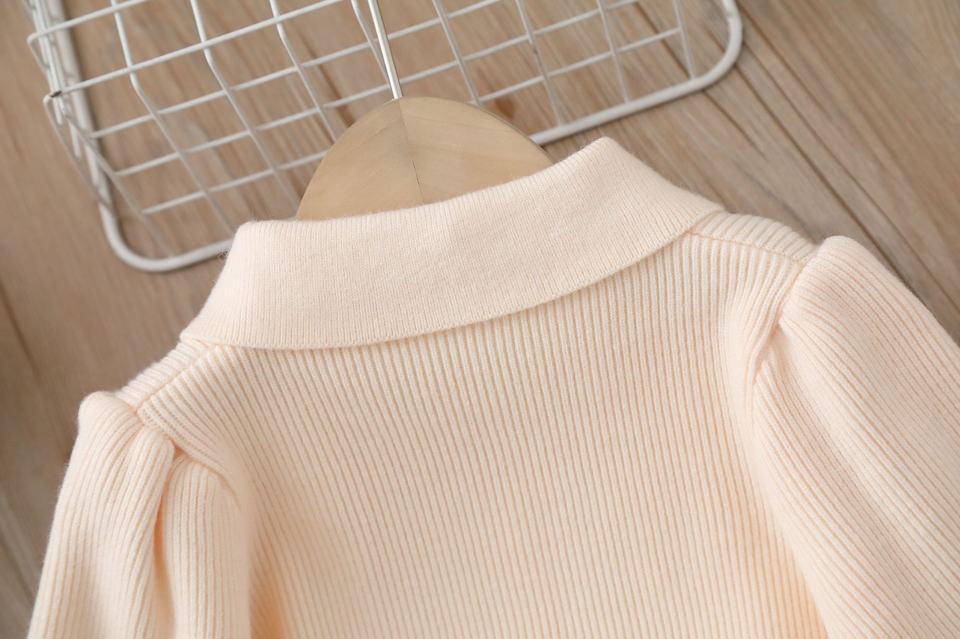– Cardigan cu mânecă lungă, confecționat din tricot moale și plăcut la atingere, în culoarea vaniliei. Modelul are guler alb contrastant, închidere frontală cu nasturi și mâneci ușor bufante, terminate cu manșete.