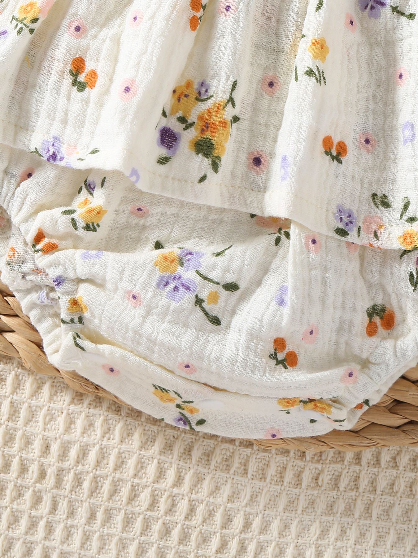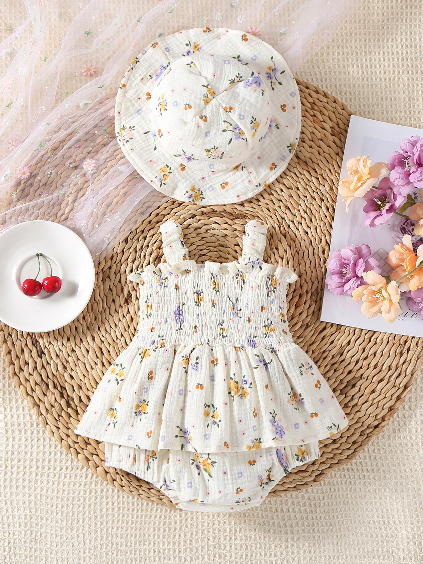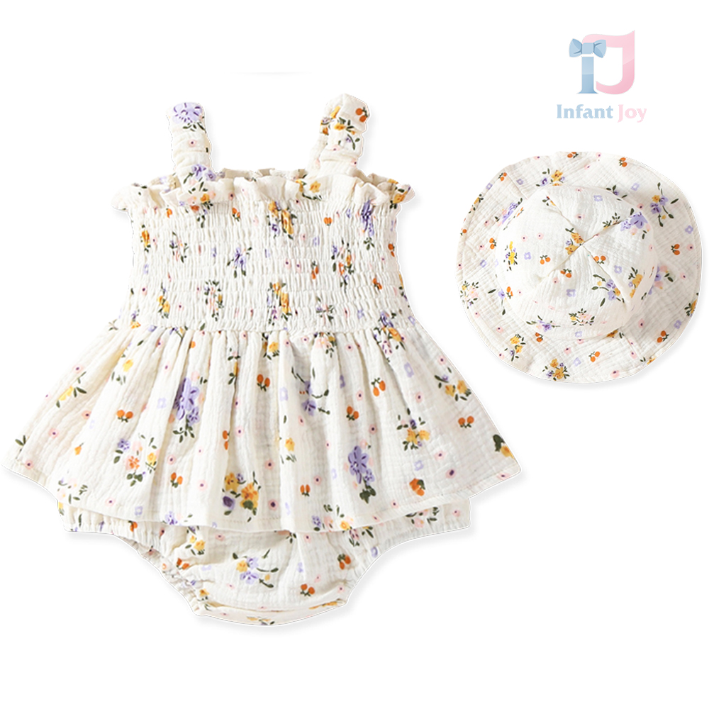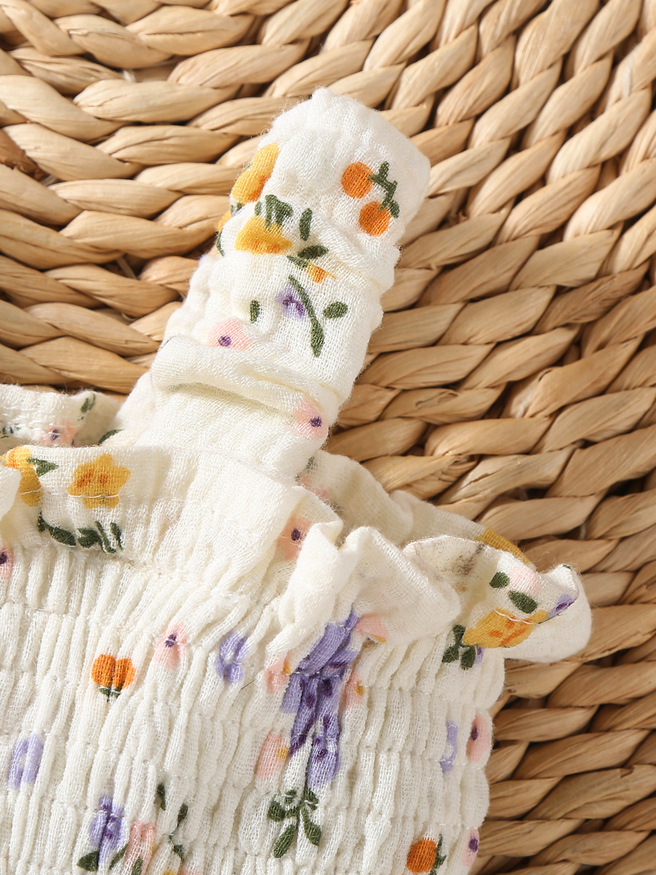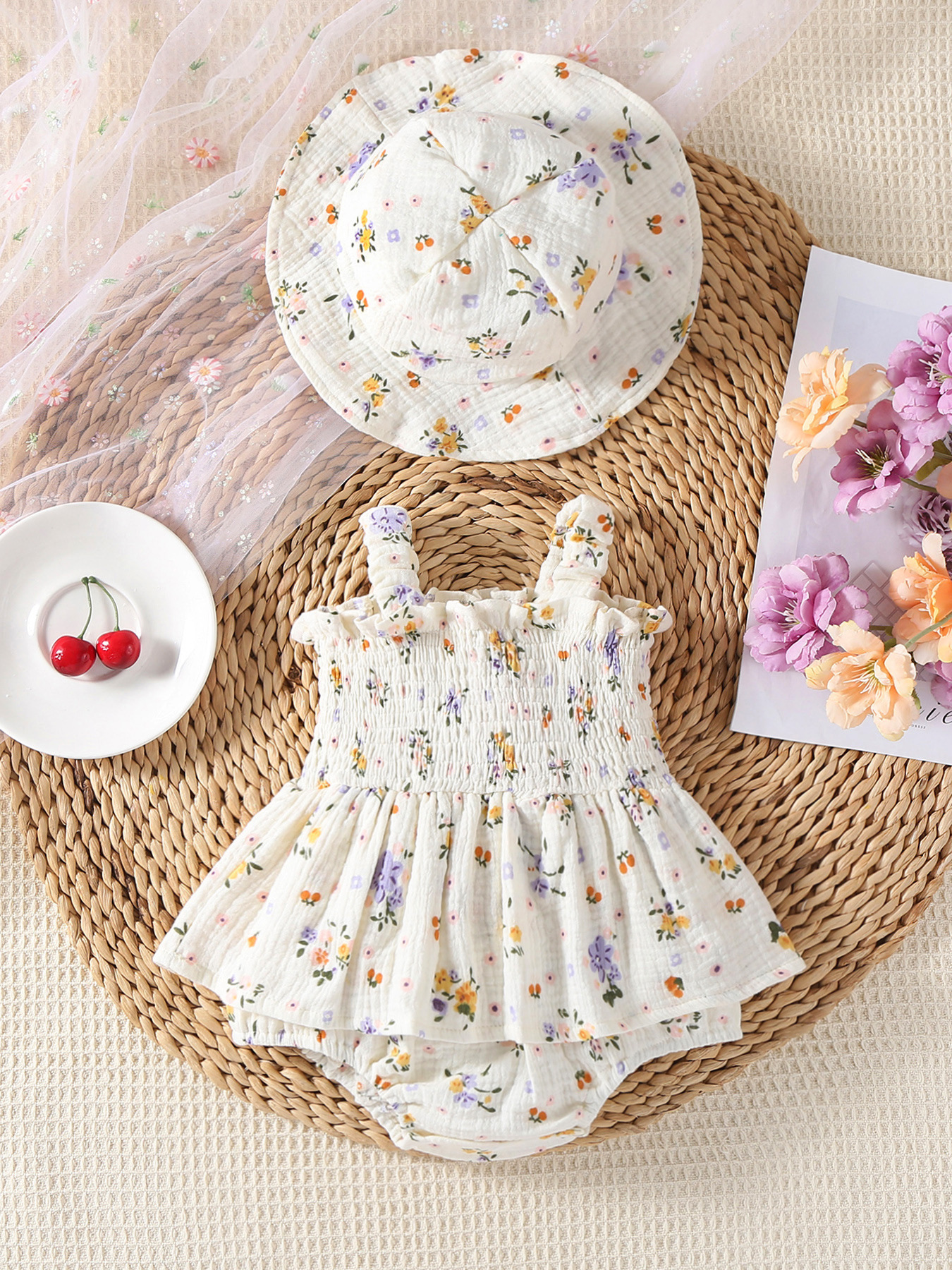 – Rochiță/body cu bretele subțiri, confecționată dintr-un material ușor și respirabil din muselină. Partea superioară are elastic tip smock, care asigură o potrivire confortabilă, iar partea inferioară este ușor evazată pentru libertate de mișcare și o notă aerată. Designul este cu un imprimeu floral delicat în tonuri pastelate, oferind o notă romantică.