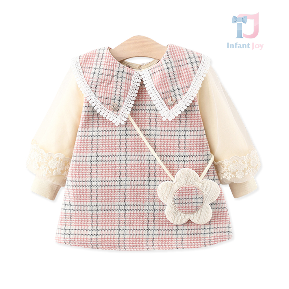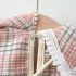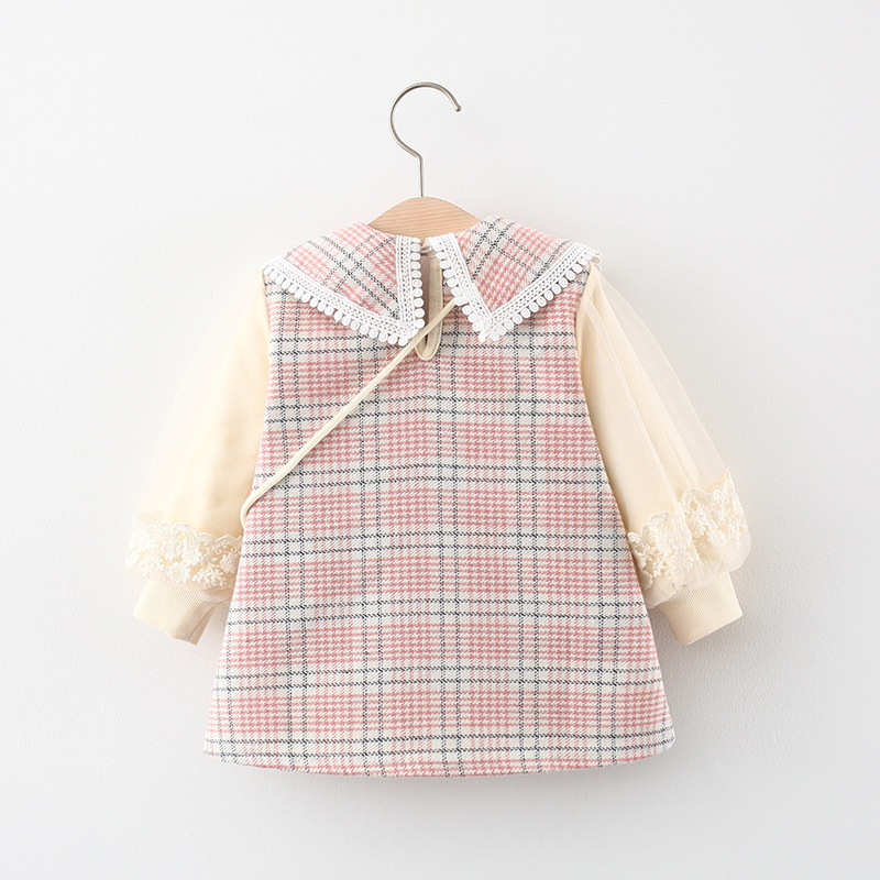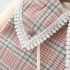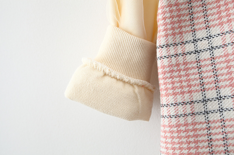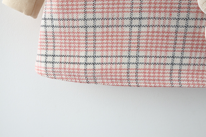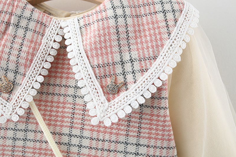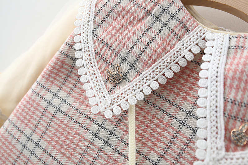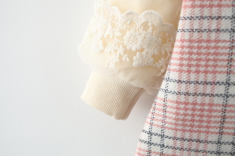 – Rochie cu mânecă lungă, confecționată din material de calitate superioară, cu un frumos model în carouri, în nuanțe delicate de roz, bej și gri. Modelul are o croială dreaptă, ușor evazată, care oferă o ținută elegantă și bine definită. Accentul este pus pe gulerul amplu tip „pelerină”, conturat cu o dantelă fină, care adaugă un aer vintage și foarte rafinat. Mâneci cu inserție de tulle, cu un volum delicat, terminate cu manșete din dantelă, care adaugă un plus de finețe și detaliu.
