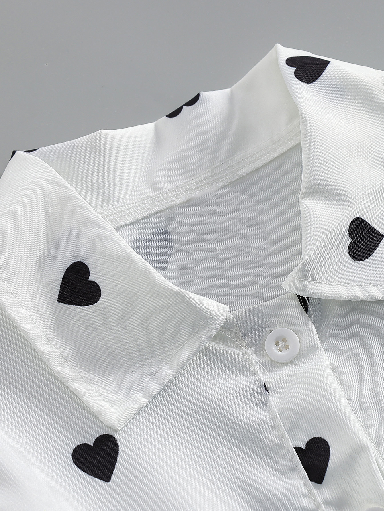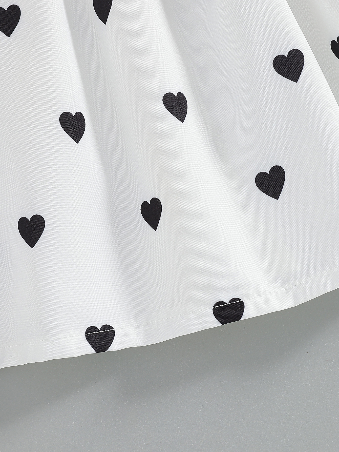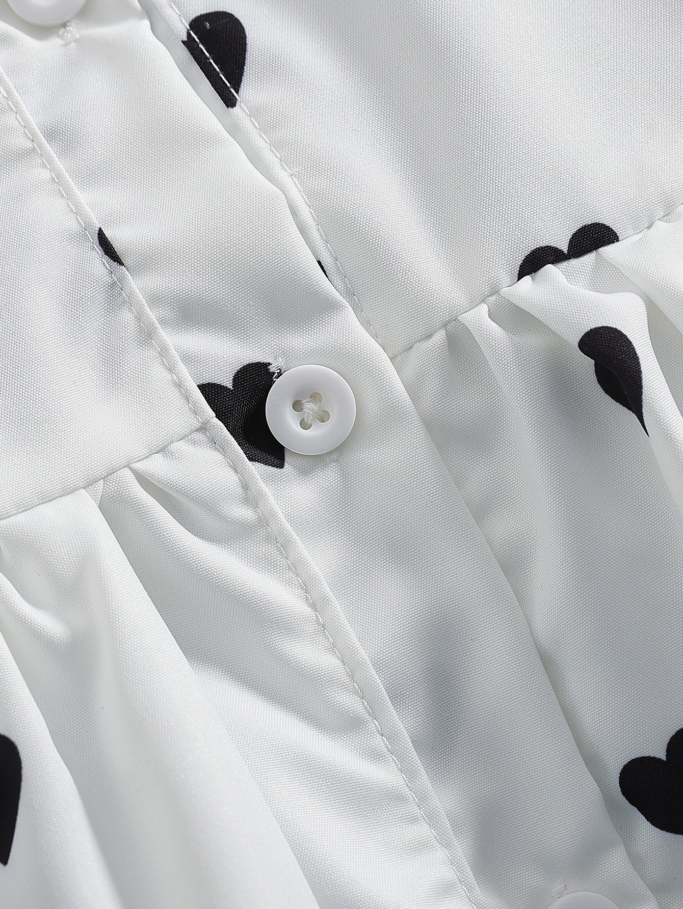 – Rochie cu mânecă scurtă, realizată dintr-un material ușor și plăcut la atingere, de culoare albă, decorată cu mici inimioare negre. Modelul are guler clasic și închidere completă în față cu nasturi. Mânecuțele sunt prevăzute cu volănașe delicate, care adaugă finețe și volum. Partea de jos este evazată, cu o ușoară încrețitură în talie, oferind lejeritate și confort la mișcare.