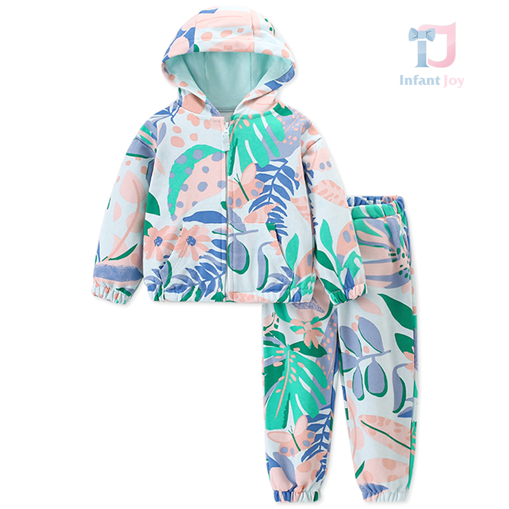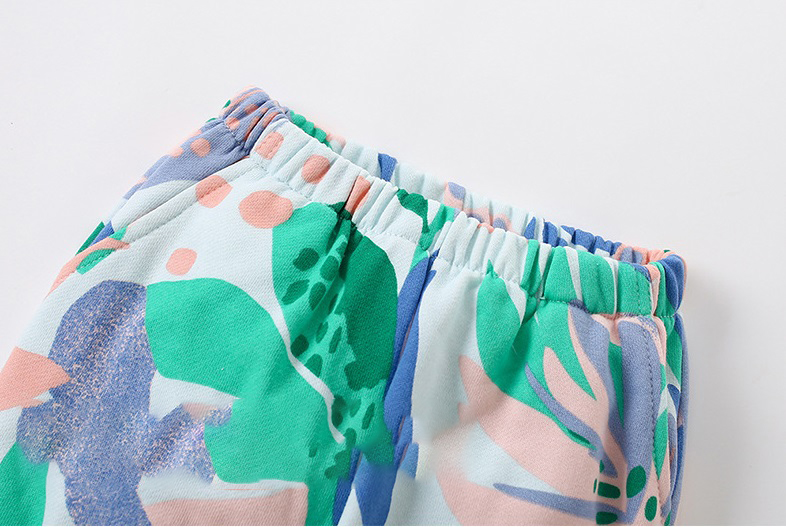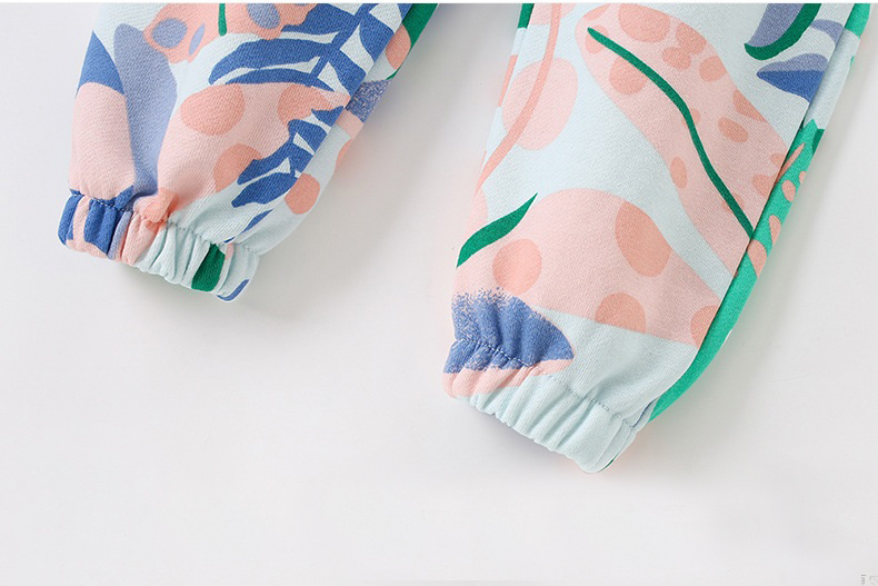 -Pantaloni lungi confecționați din același material, cu talie și manșete elastice pentru libertate de mișcare. Imprimeul continuă pe toată lungimea, creând un aspect armonios, iar buzunarele laterale adaugă practicitate pentru micile comori ale copiilor.