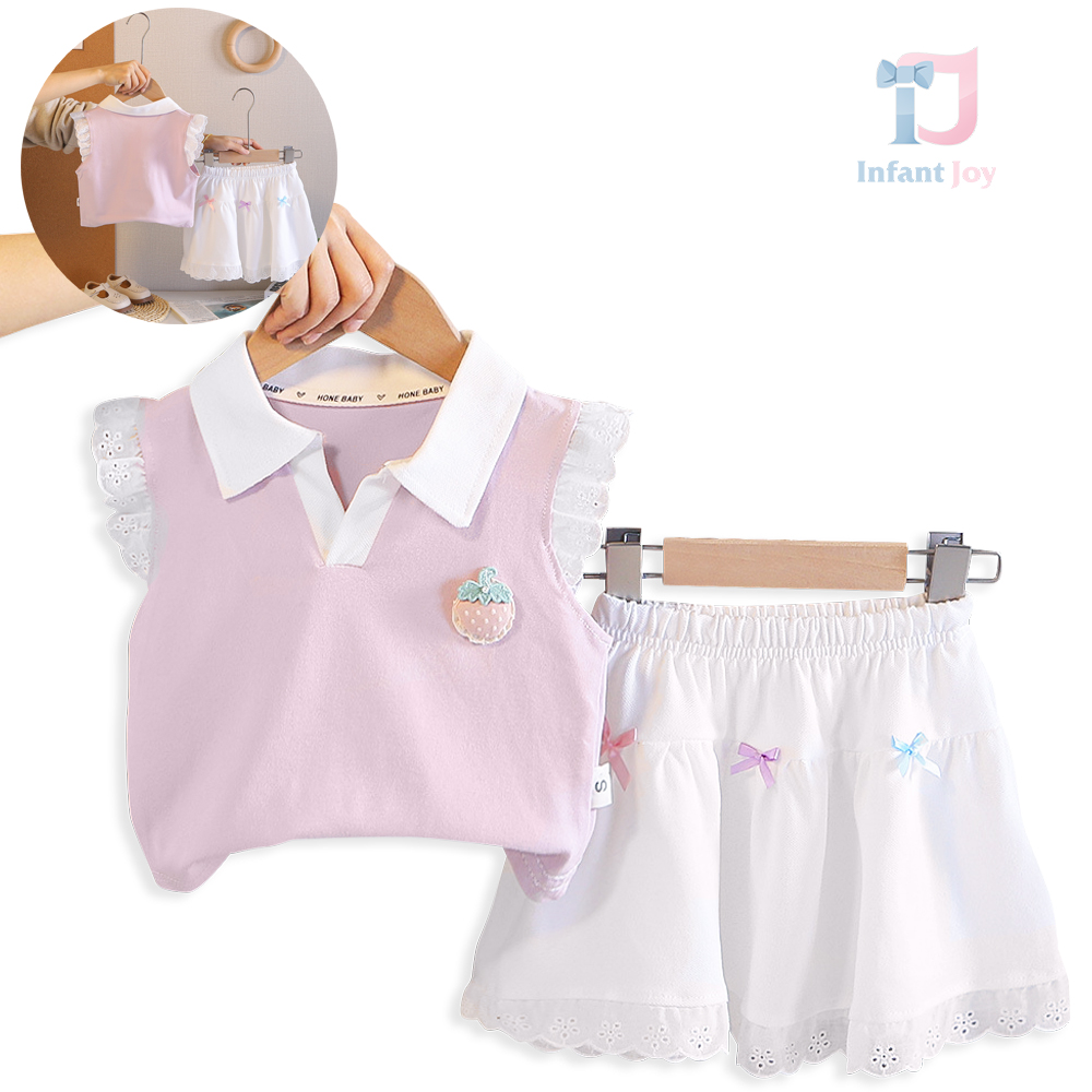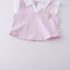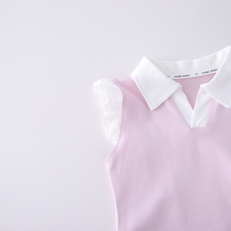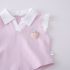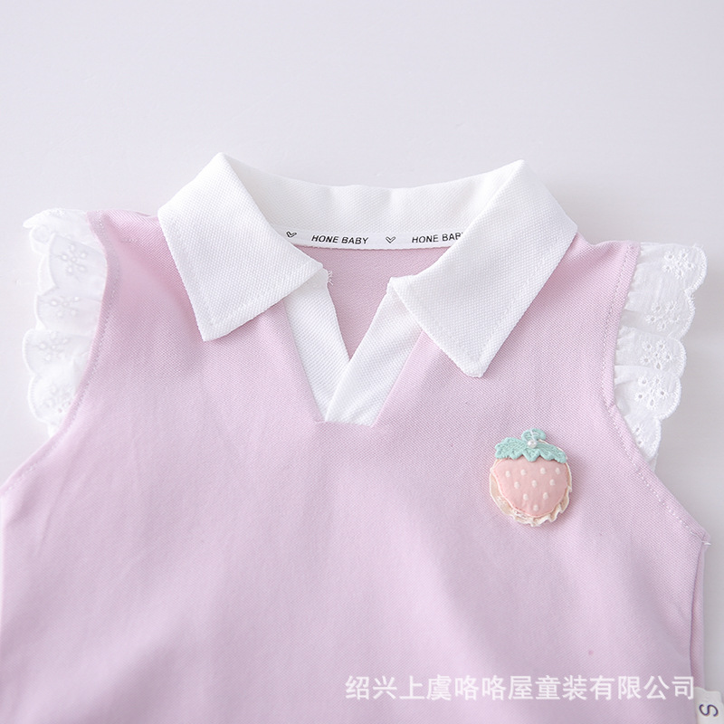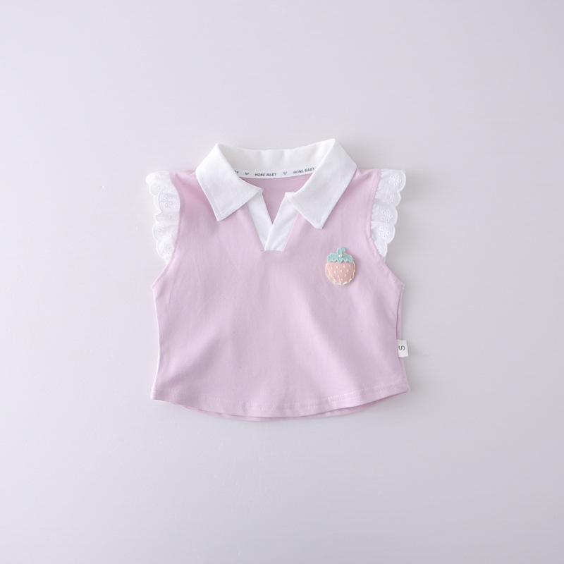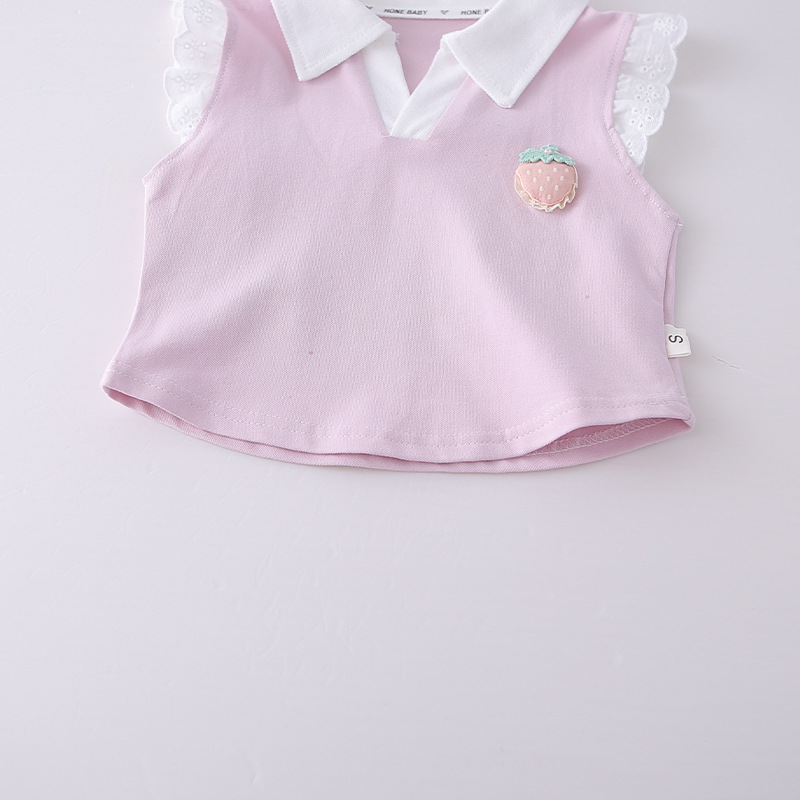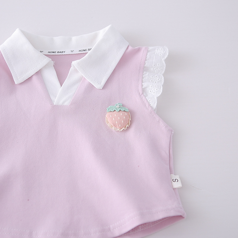 – Bluză fără mâneci, cu efect, confecționată din material lacoste de înaltă calitate, într-o nuanță delicată de roz. Modelul are guler clasic alb tip polo și umeri decorați cu volănașe fine din dantelă, care oferă un aspect extrem de delicat și elegant. În partea din față este adăugat un element 3D drăguț – o căpșună, care aduce un accent proaspăt și jucăuș. Croiala este comodă și ușor lejeră.