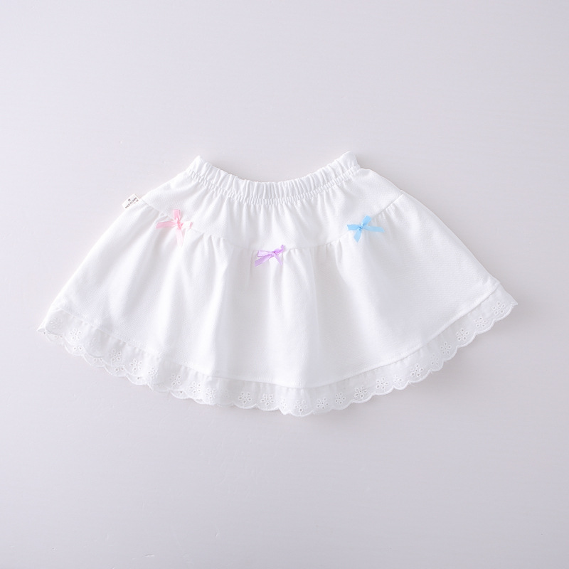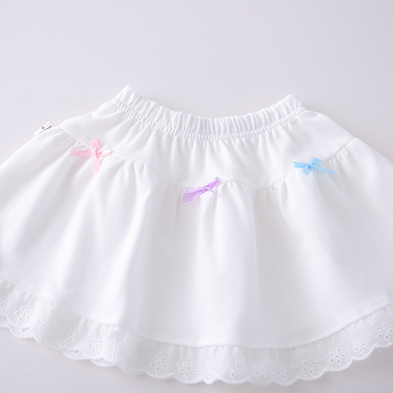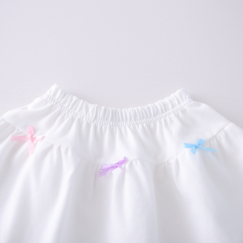 – Fustă albă, realizată din material ușor și aerat. Modelul are talie elastică pentru confort și îmbrăcare facilă. Designul este pe straturi, cu un volum ușor, decorat în față cu fundițe mici și colorate. Partea de jos este finisată cu dantelă fină pentru un aspect și mai romantic.