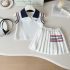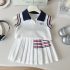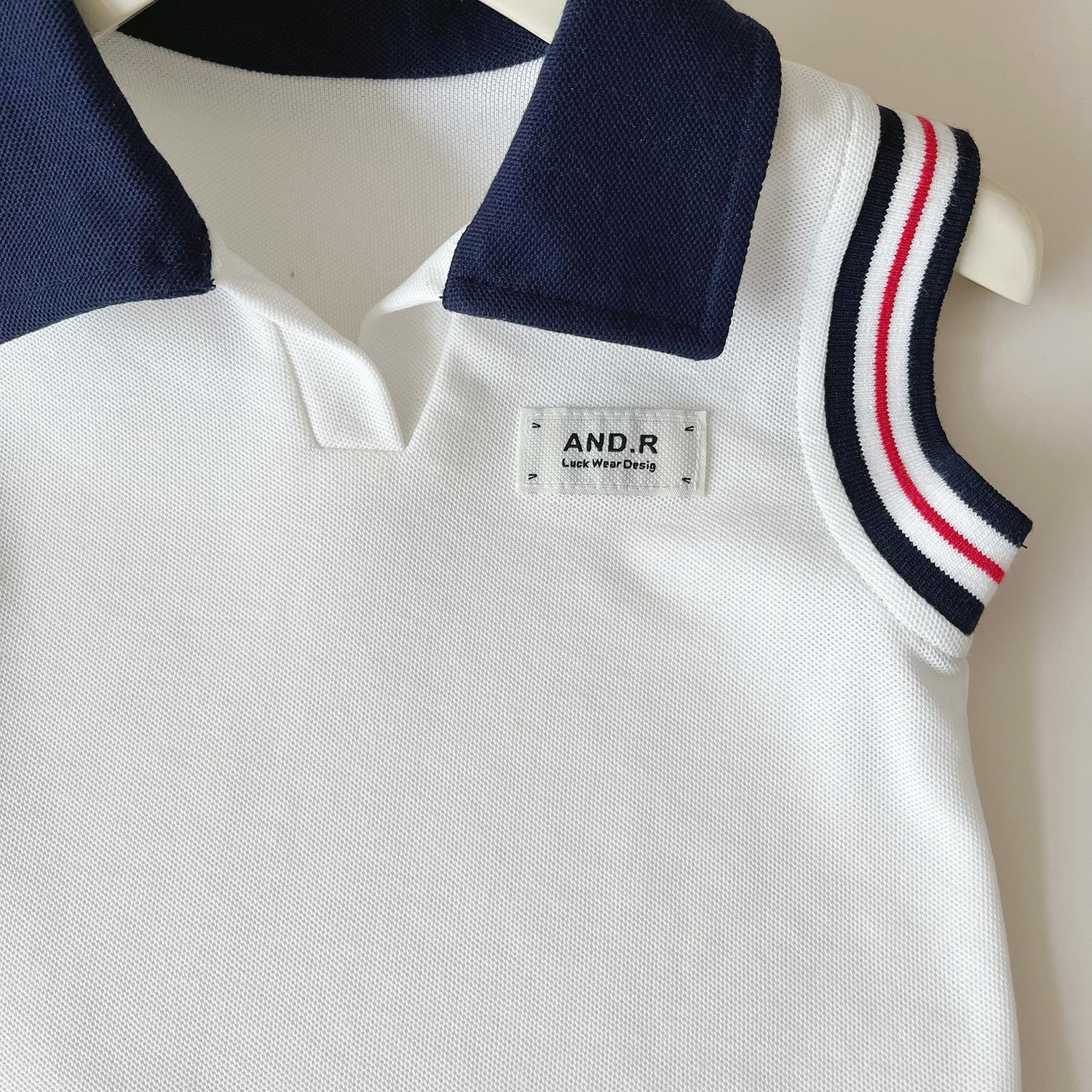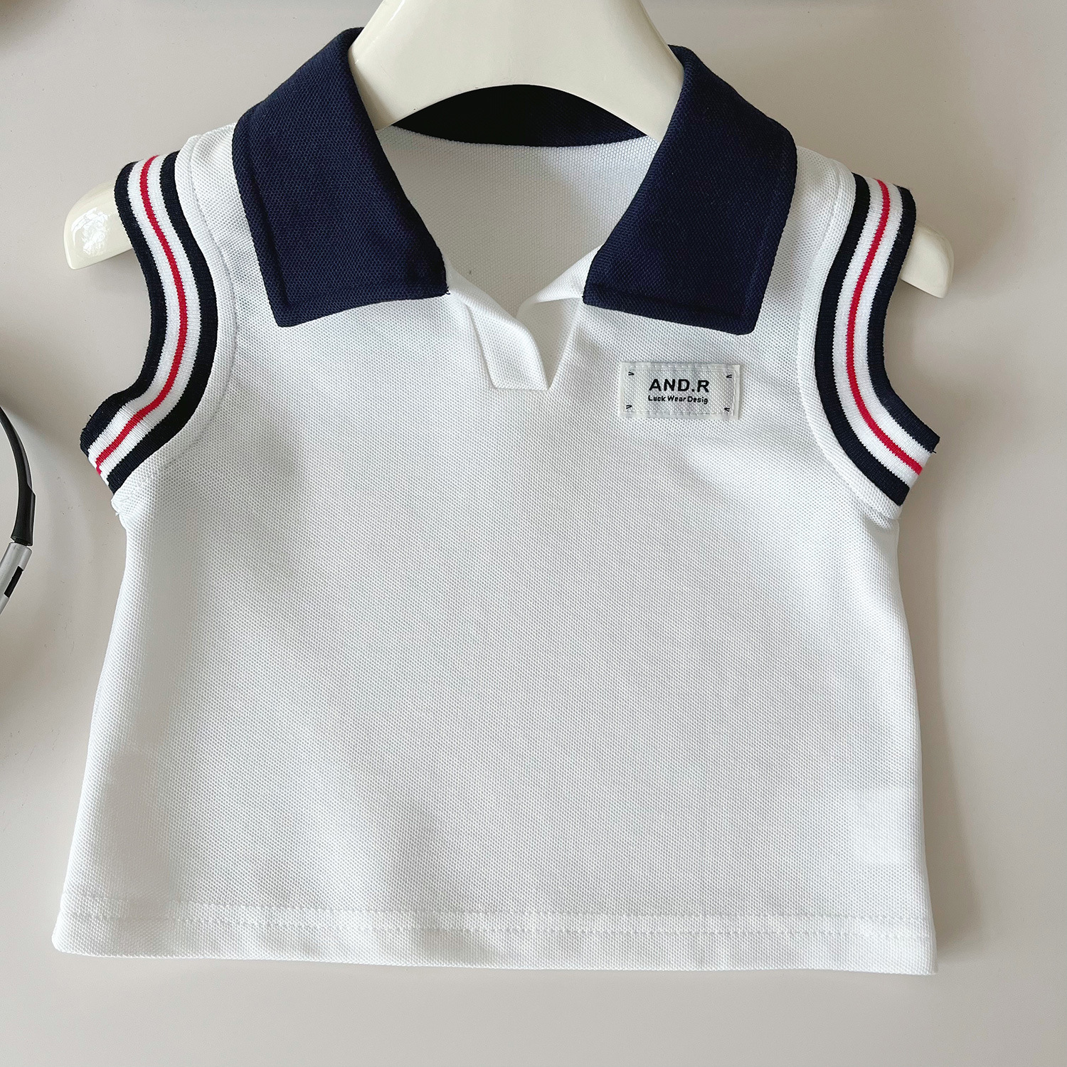 – Top fără mâneci tip polo, confecționat din material lacoste de înaltă calitate, în alb imaculat. Modelul are guler contrastant în nuanță bleumarin și decolteu ușor deschis, care oferă eleganță. Umerii sunt evidențiați cu benzi decorative în alb, roșu și bleumarin, care adaugă un aspect sportiv și modern. În față este aplicată o mică etichetă ca detaliu final.
