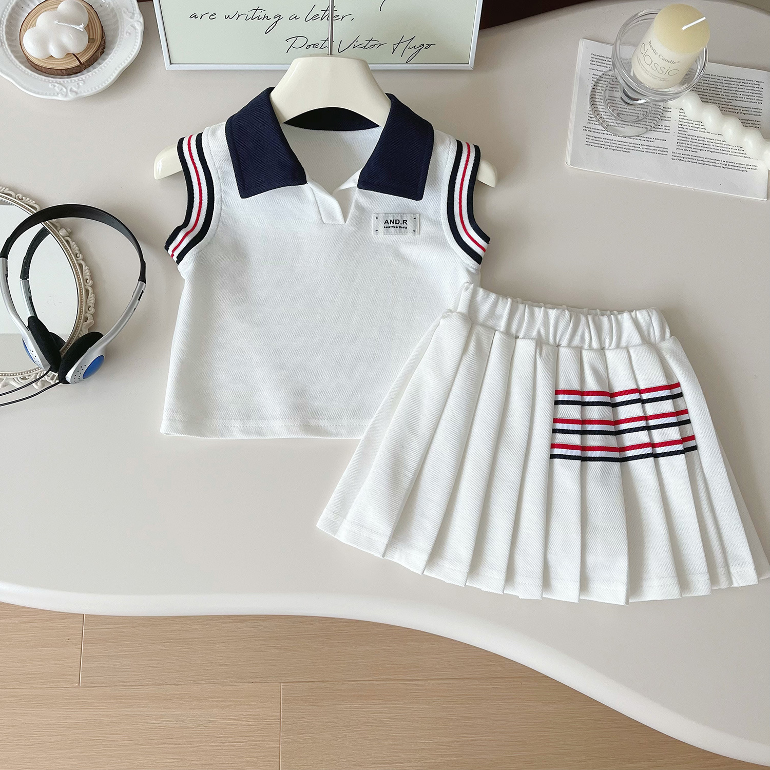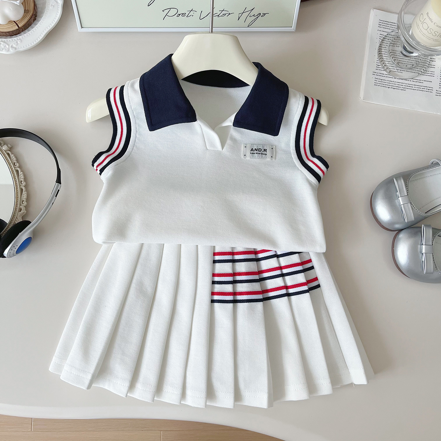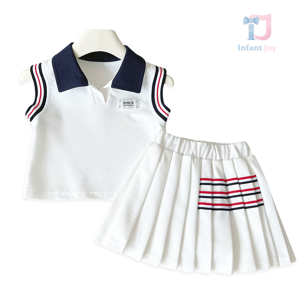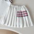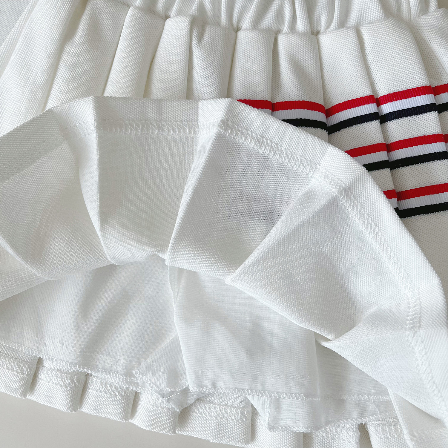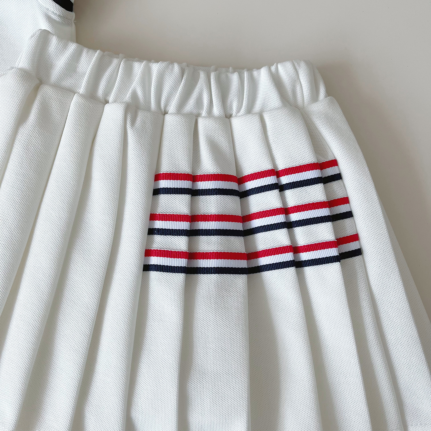 – Fustă plisată în culoare albă, realizată din același material confortabil. Modelul are căptușeală tip pantalonaș și talie elastică pentru confort și îmbrăcare ușoară. Este decorată cu linii contrastante în roșu și bleumarin în partea superioară, care completează ținuta și creează o armonie perfectă cu topul. Croiala este lejeră și oferă libertate de mișcare.