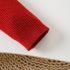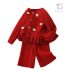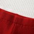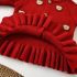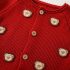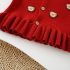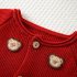 – Partea de sus (cardigan/bluză) – confecționată dintr-un tricot moale, cu textură ripsată, într-o nuanță intensă de roșu. Se încheie în față cu nasturi și este decorată cu aplicații catifelate în formă de ursuleți, care adaugă o notă jucăușă. În partea de jos are un volan ușor evazat, ce oferă un aspect delicat și feminin.
