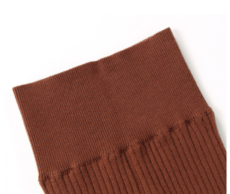 – Pulover cu mânecă lungă, realizat din tricot reiat moale și elastic, în nuanță maro ciocolată, care oferă căldură și libertate de mișcare.