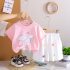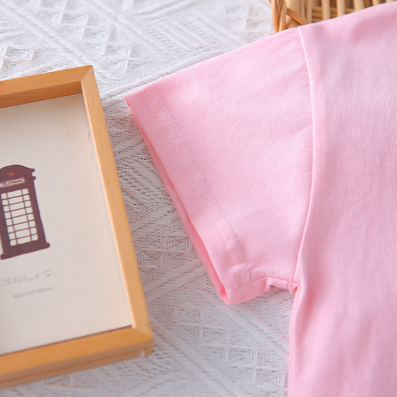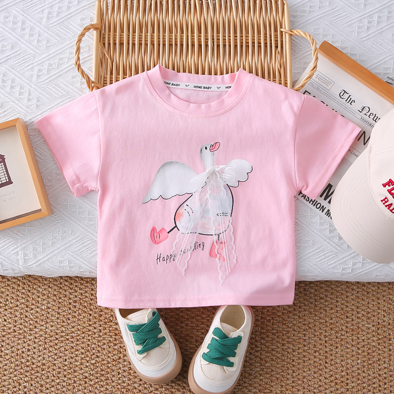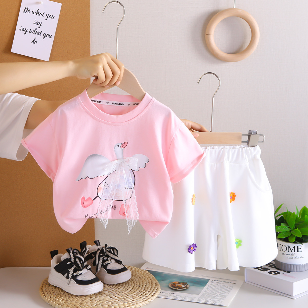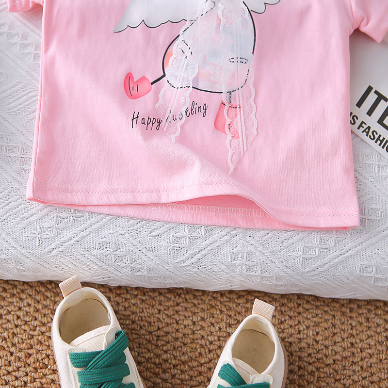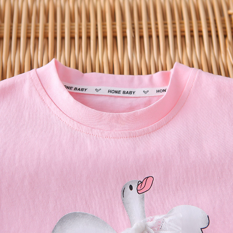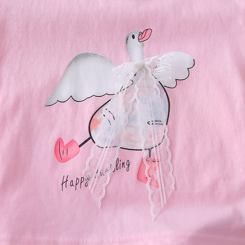 Set de 2 piese din tricou cu fundiță din dantelă și pantaloni scurți cu broderii 3D colorate Graceful Swan Pink